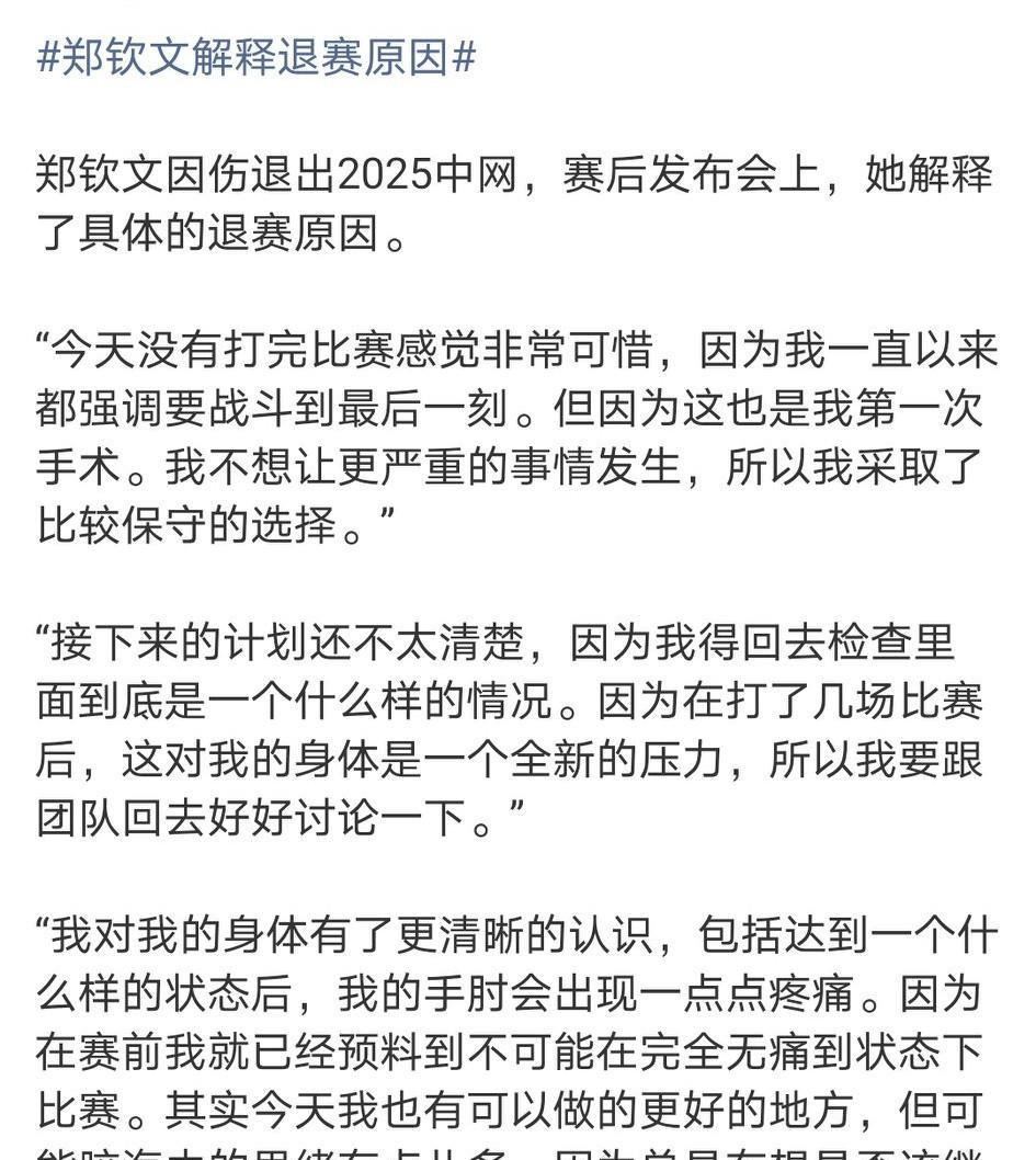 郑钦文冒险强行复出,终于造成不可挽回的后果,而且后面的武汉赛东京赛大概都要退赛。想想那年的刘翔…… 1、没听从团队的安排,硬要冒险复出。 2、可能是利益集团的安排。 3、可能是代言商的安排。