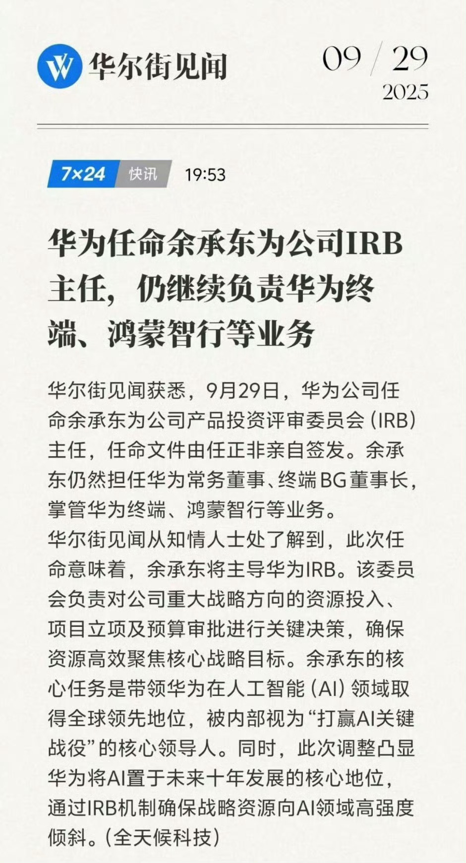 这是华为最高决策层的核心职位,之前由徐直军、汪涛等公司高管担任。余承东增任华为IRB主任掌管AI