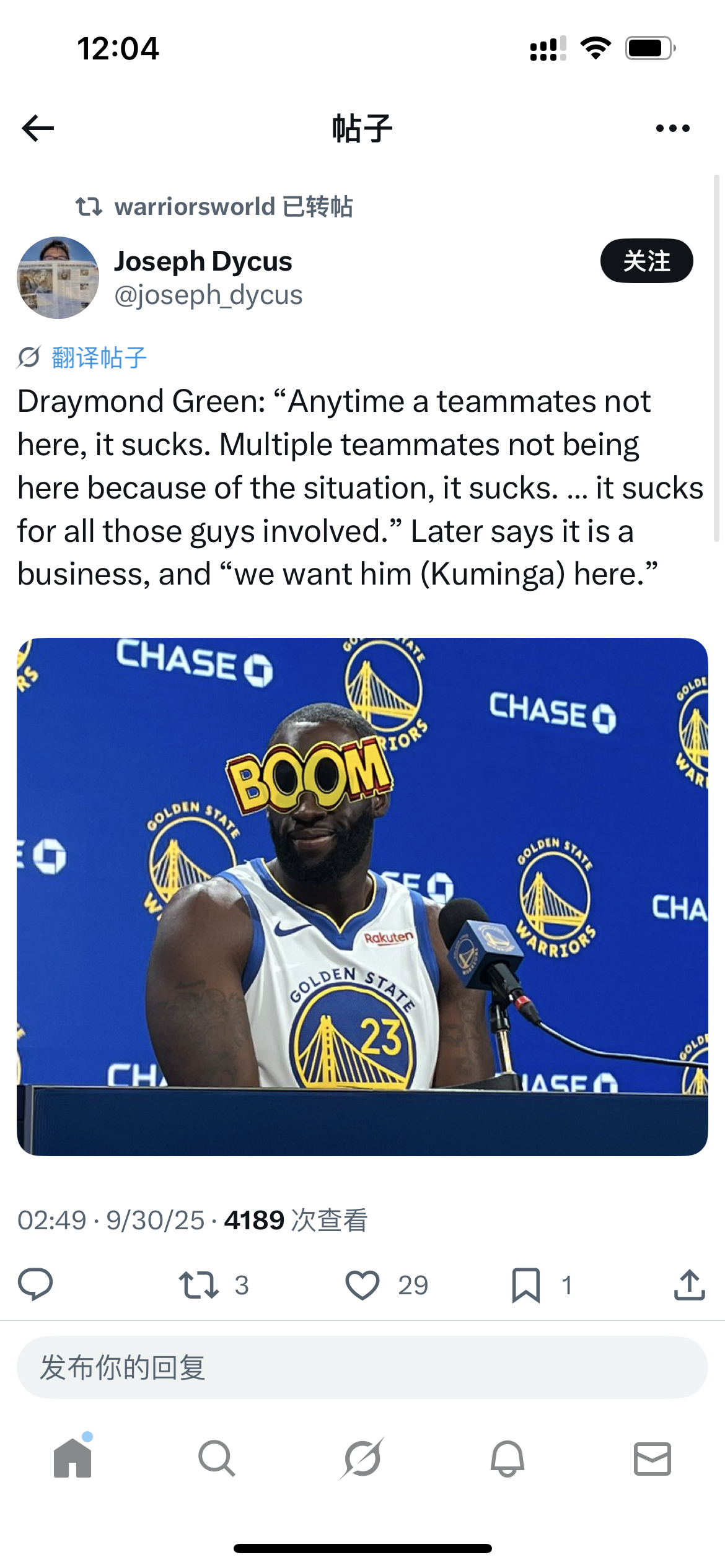 勇士媒体日有点意思信息就是三个大佬对于库明加目前情况的表态: