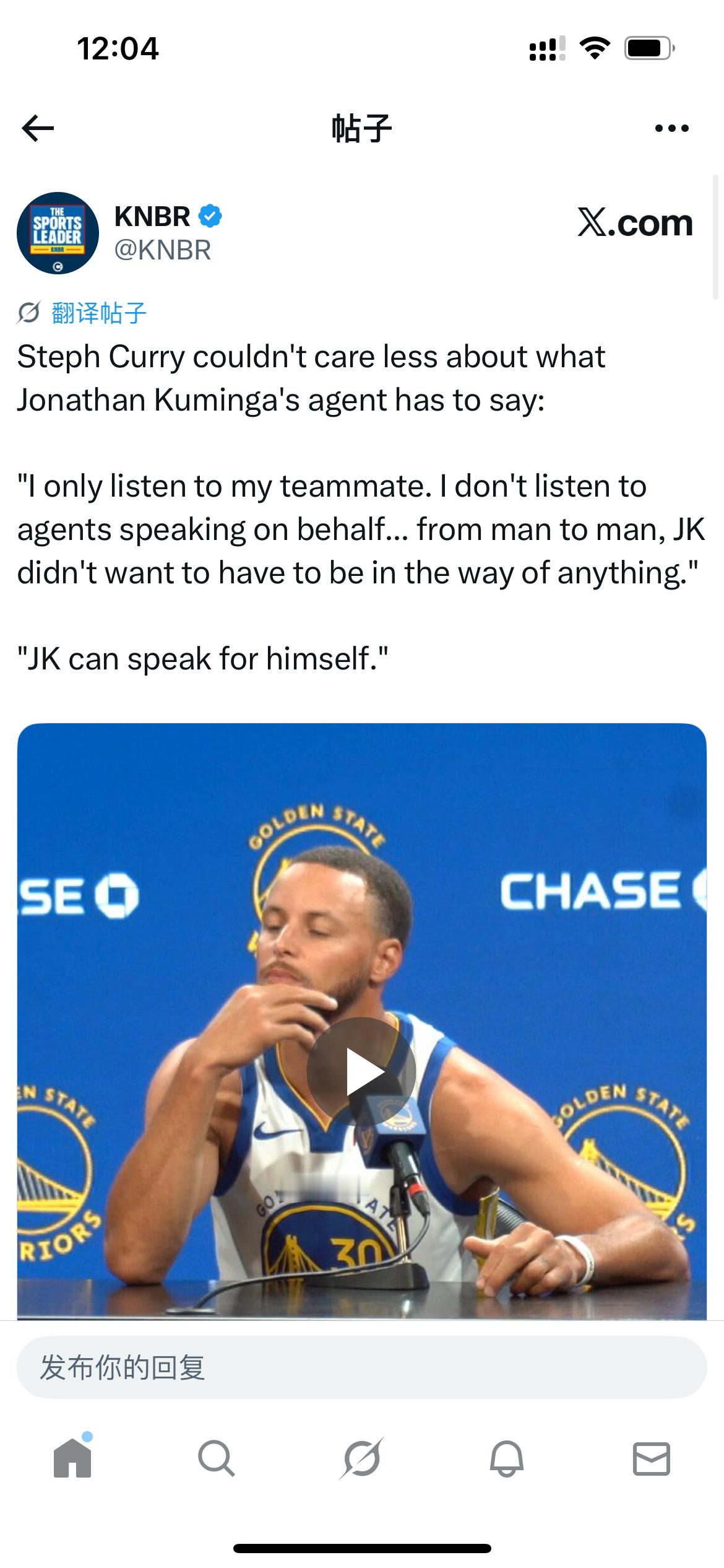 库里也提到他并不在乎库明加经纪人的话,并强调:“我只听我的队友。我不听代表(队友)发言的经纪人……从人对人的角度来说,JK 不想成为任何事情的障碍。JK 可以为自己说话。”