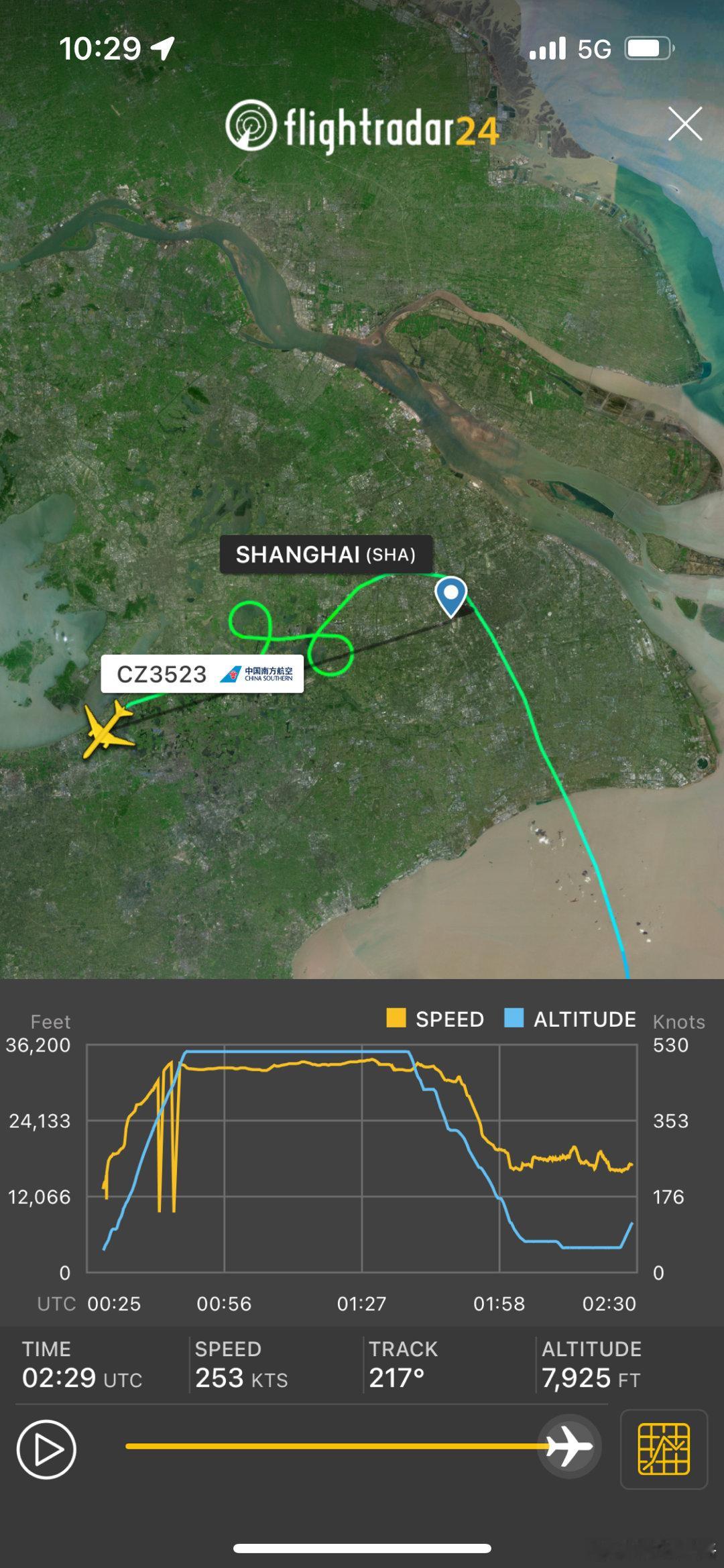 上海突发暴雨,看到前序航班绕飞两圈后开始上升高度,希望不用备降吧