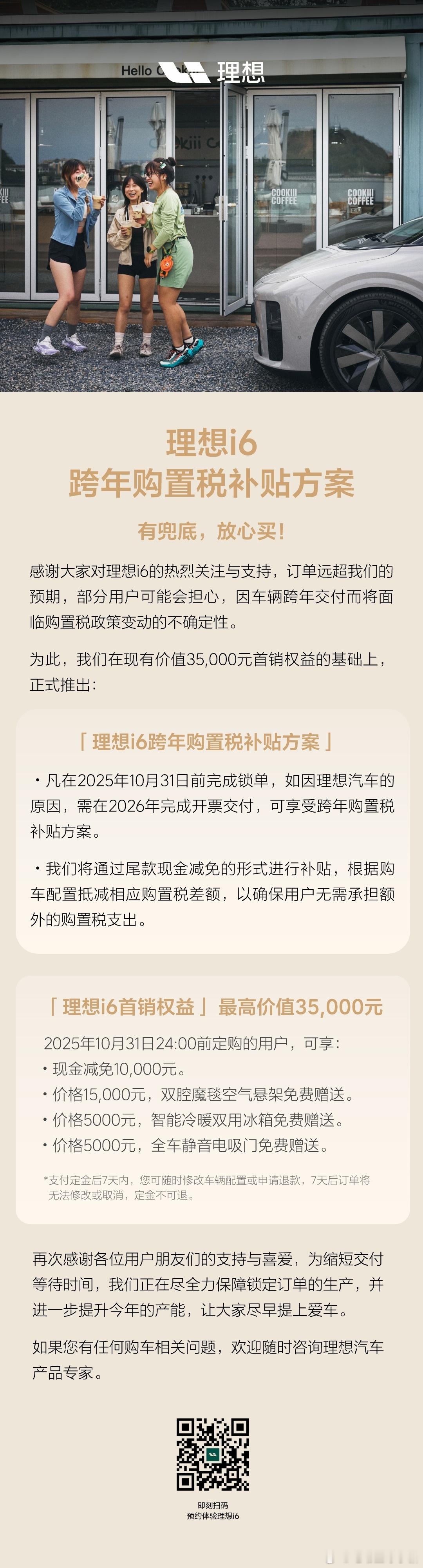 10 月 31 日前完成锁单,如因理想汽车的原因,需在 2026 年完成开票交付,理想汽车将为用户兜底因购置税退坡产生的差额费用。