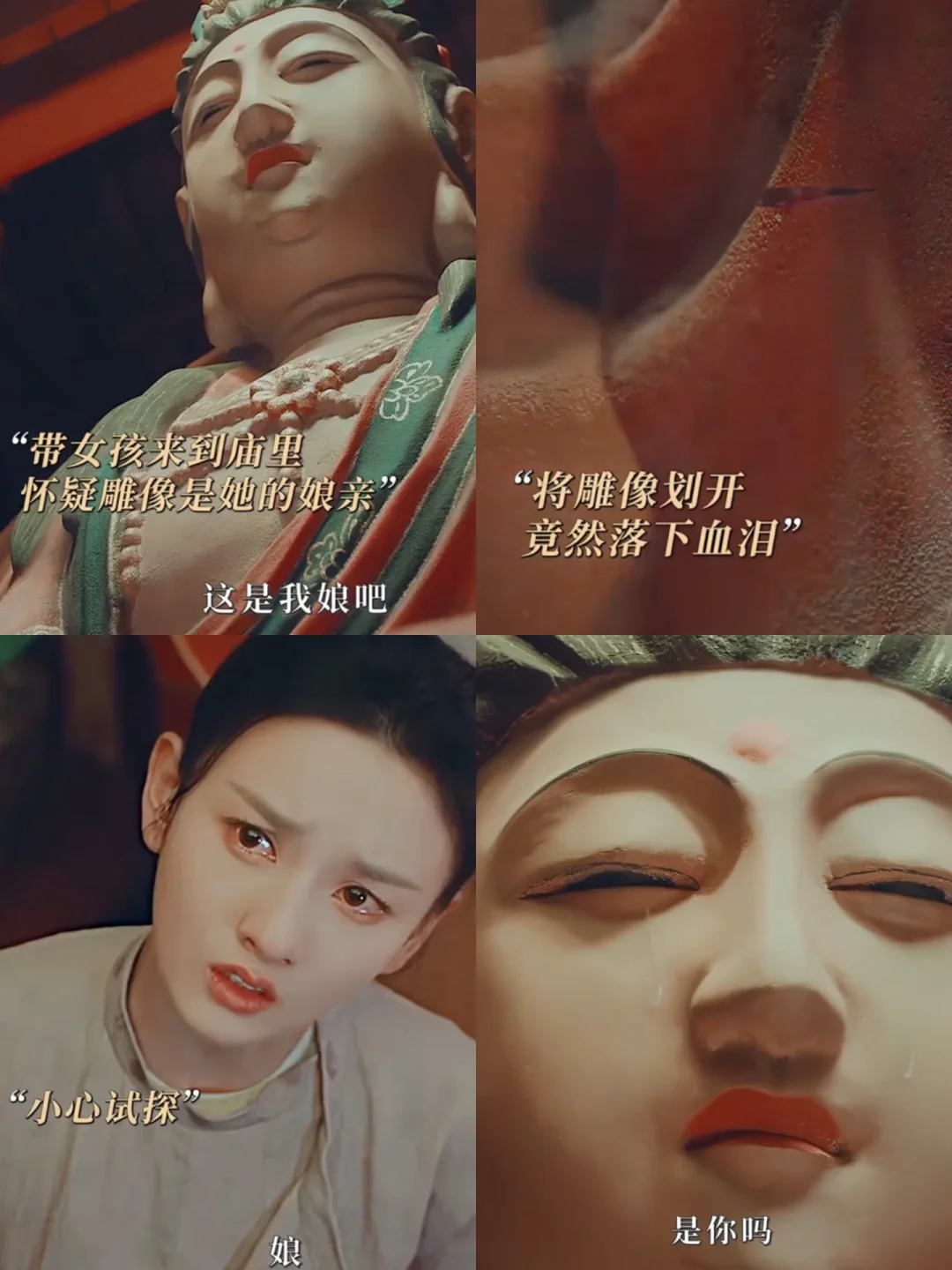 ‼️半夏在画中找到了失散多年的母亲,但母亲已成为了一座雕像,用🔪割划会流出血来,当半夏叫娘时雕像会落泪。 ‼️父亲也在画中与半夏重逢,可他却变成了一个盲哑僧人,半夏不解这一切到底怎么回事? . ‼️半夏让父亲摸摸自己的脸,而父亲也很快认出了半夏,但却叫不出女儿的名字,父女二人相拥而泣。 ‼️好在最后宣夜找到此画无月的破绽,成功解救出困在画里的人,半夏阿娘之所以被困在这里是因为怯月虫像完成“观音落泪”的奇景,将半夏父女二人吸入画中。