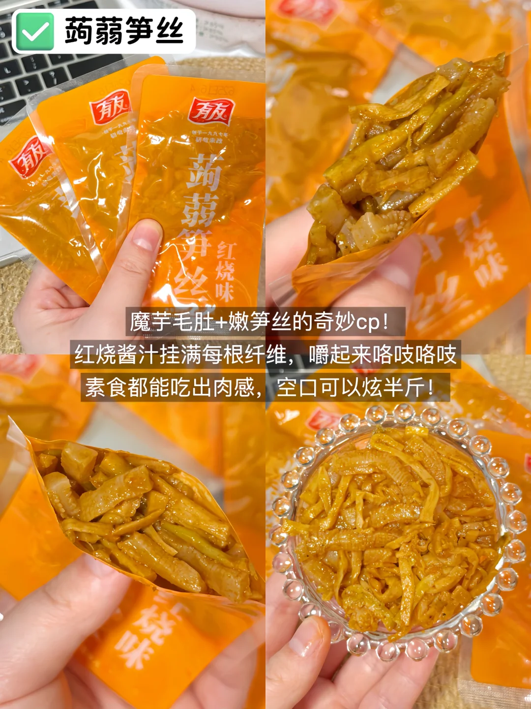 笋控必冲!蒟蒻笋丝嚼起来嘎吱作响,鲜嫩笋丝和魔芋素毛肚的搭配太妙了!红烧酱汁浓稠入味,每一根都裹满灵魂酱汁,我直接炫完整包!