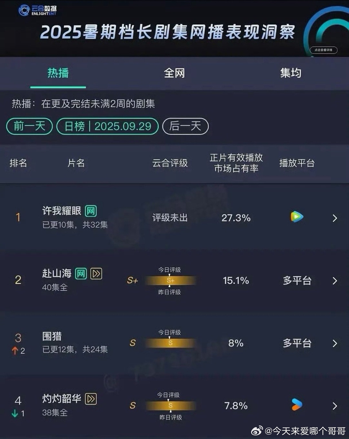 昨日云合赵露思许我耀眼27.3%,继续登顶