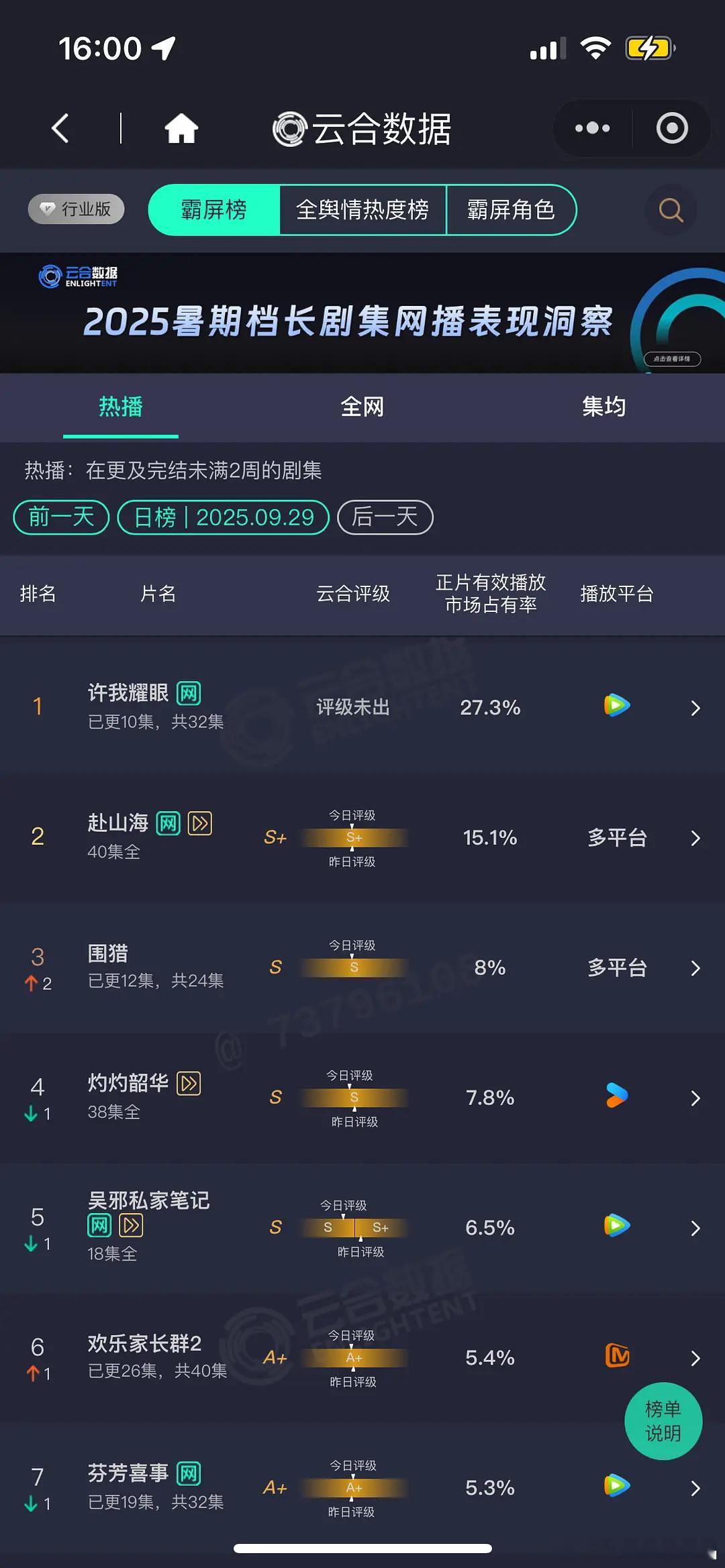 9月29日云合许我耀眼27.3%占比继续提高赴山海15.1%围猎8%