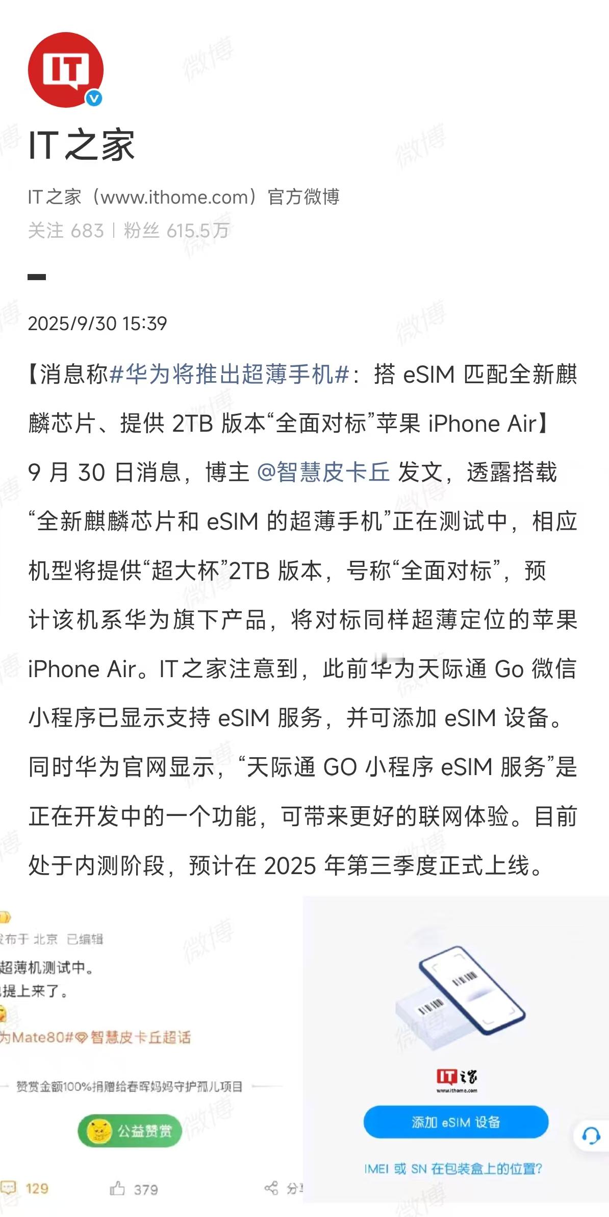 [doge]不是空穴来风,华为确实是在测试超薄机,支持eSIM,超大杯或有2TB...
