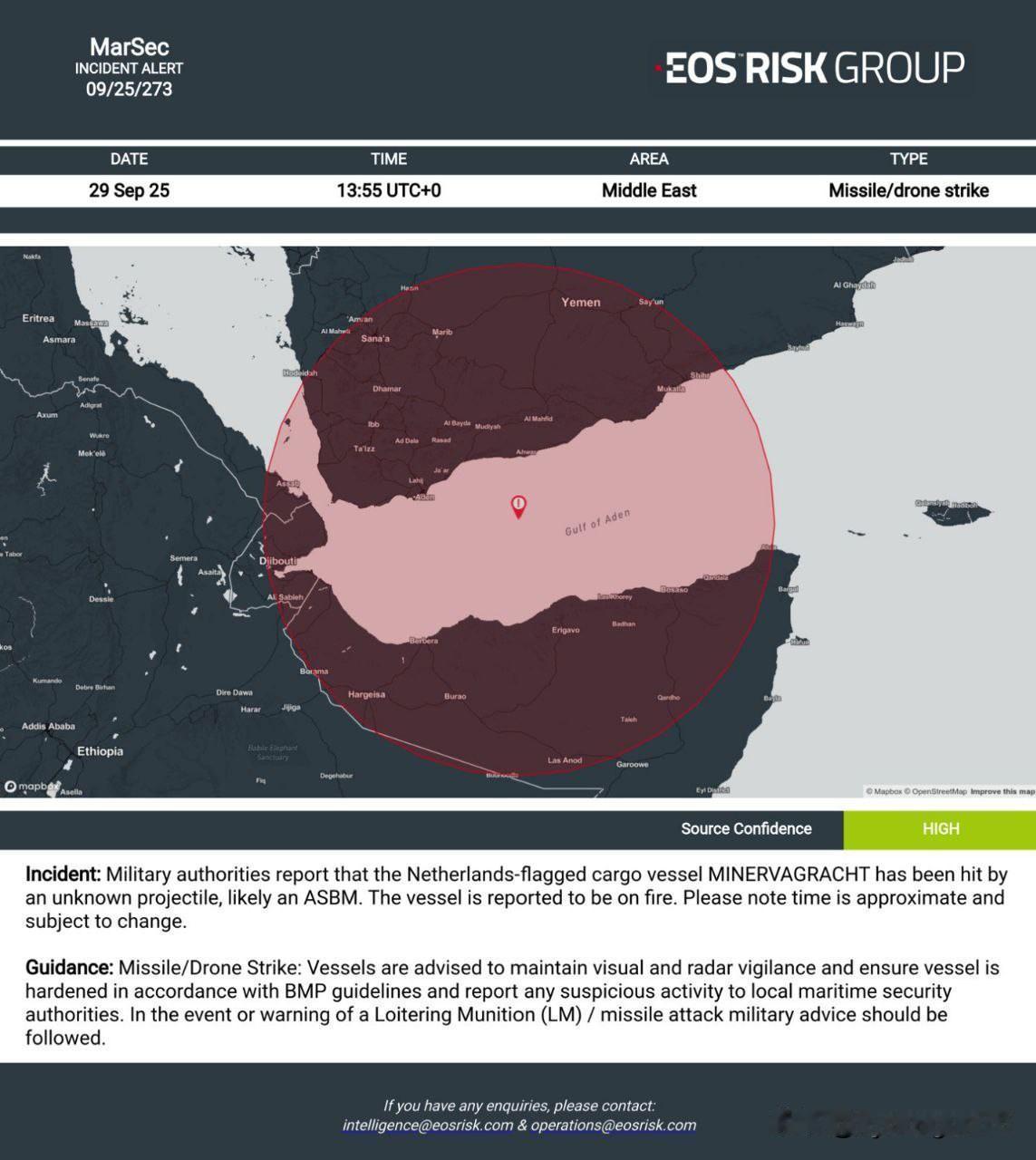 🇾🇪🇳🇱据报道,胡塞武装成功向悬挂荷兰国旗的“米涅瓦运河”号(Minervagracht)发射了一枚反舰弹道导弹,该船位于亚丁湾。 另据报道,该船发生火灾,船员弃船逃生。另有两名船员受伤。