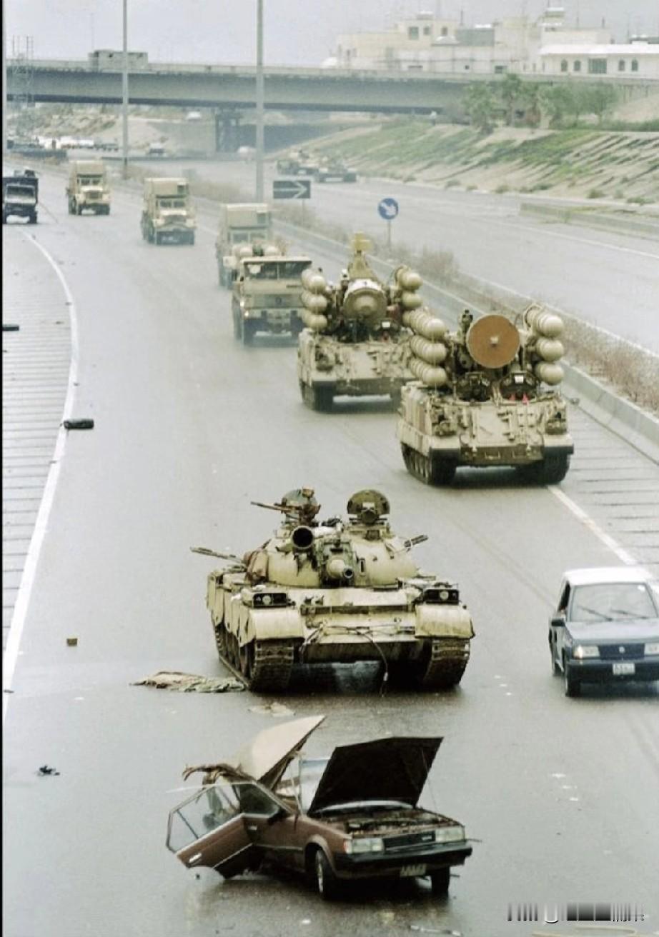 海湾战争期间,一队军用装备车辆快速机动通过,可以看的出这里发生过激烈战斗,有民用车辆被击毁,也有坦克被击毁后抛弃。 从照片看,第一辆坦克疑似是一辆伊拉克的T62,外形整体保存良好,应该是关键设备被炸毁,也可能只是出现故障或者被坦克成员直接抛弃了。 后面的应该是西方地面部队和防空导弹车,不知道这是西方的那款防空系统。从画中也能看到当时的民用车间在军车面前是多么的渺小。