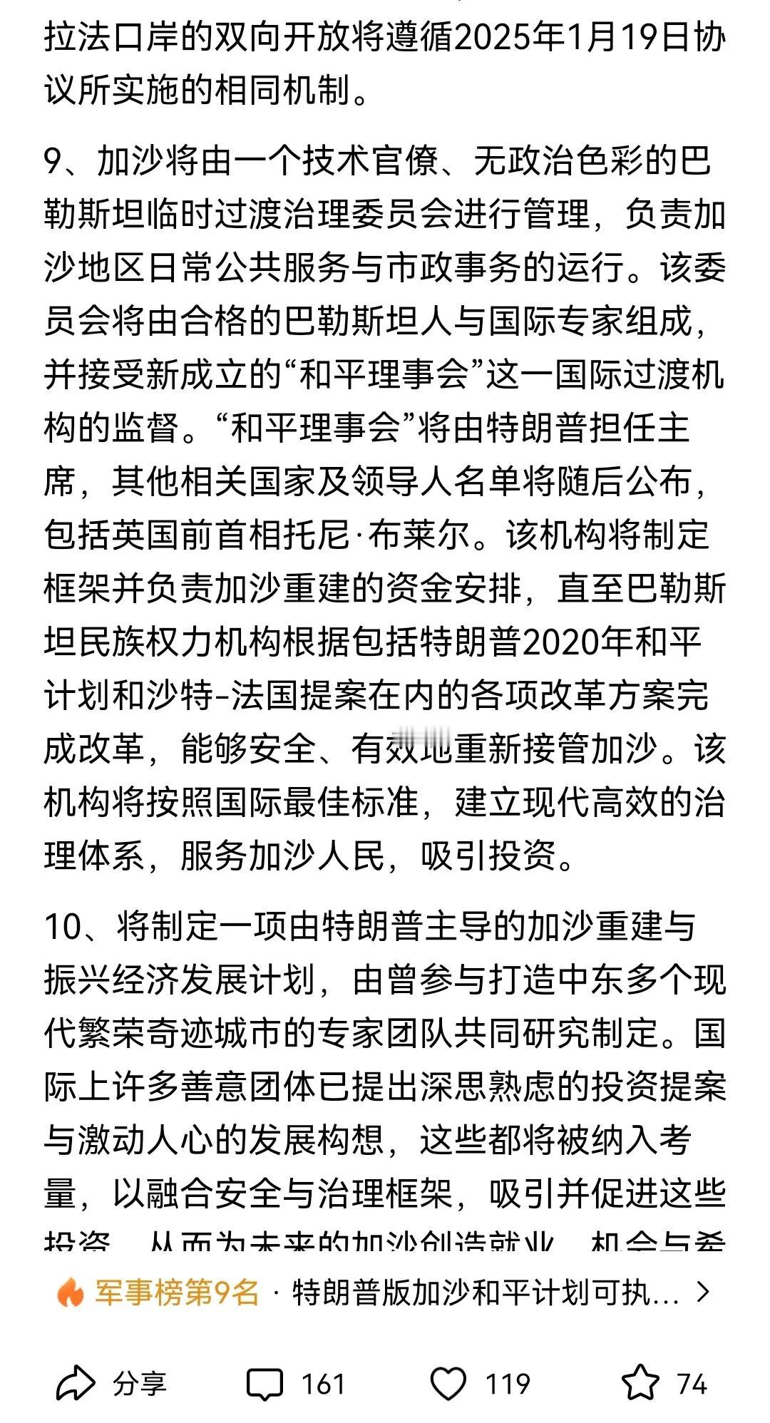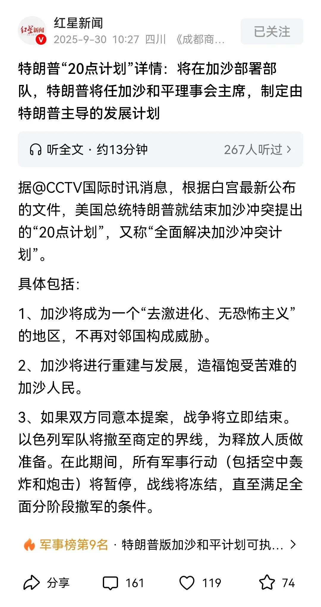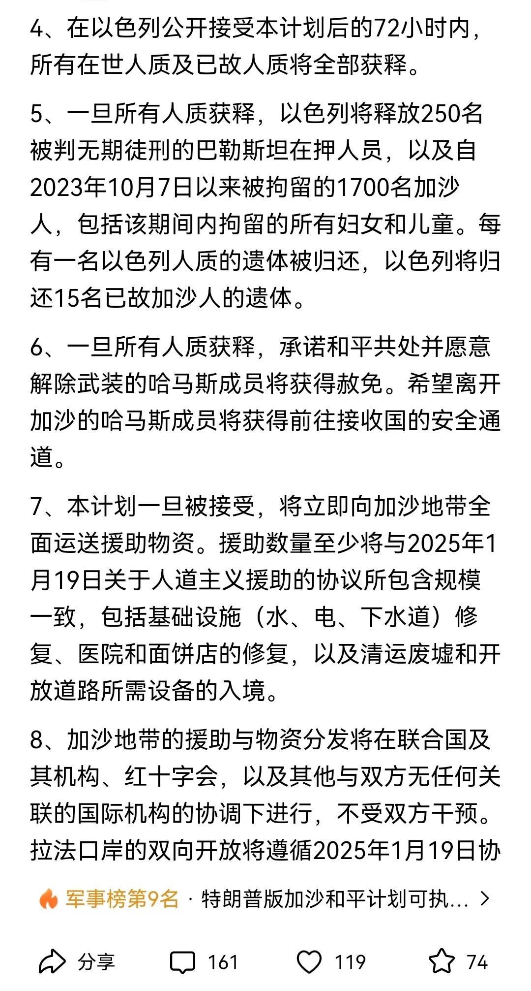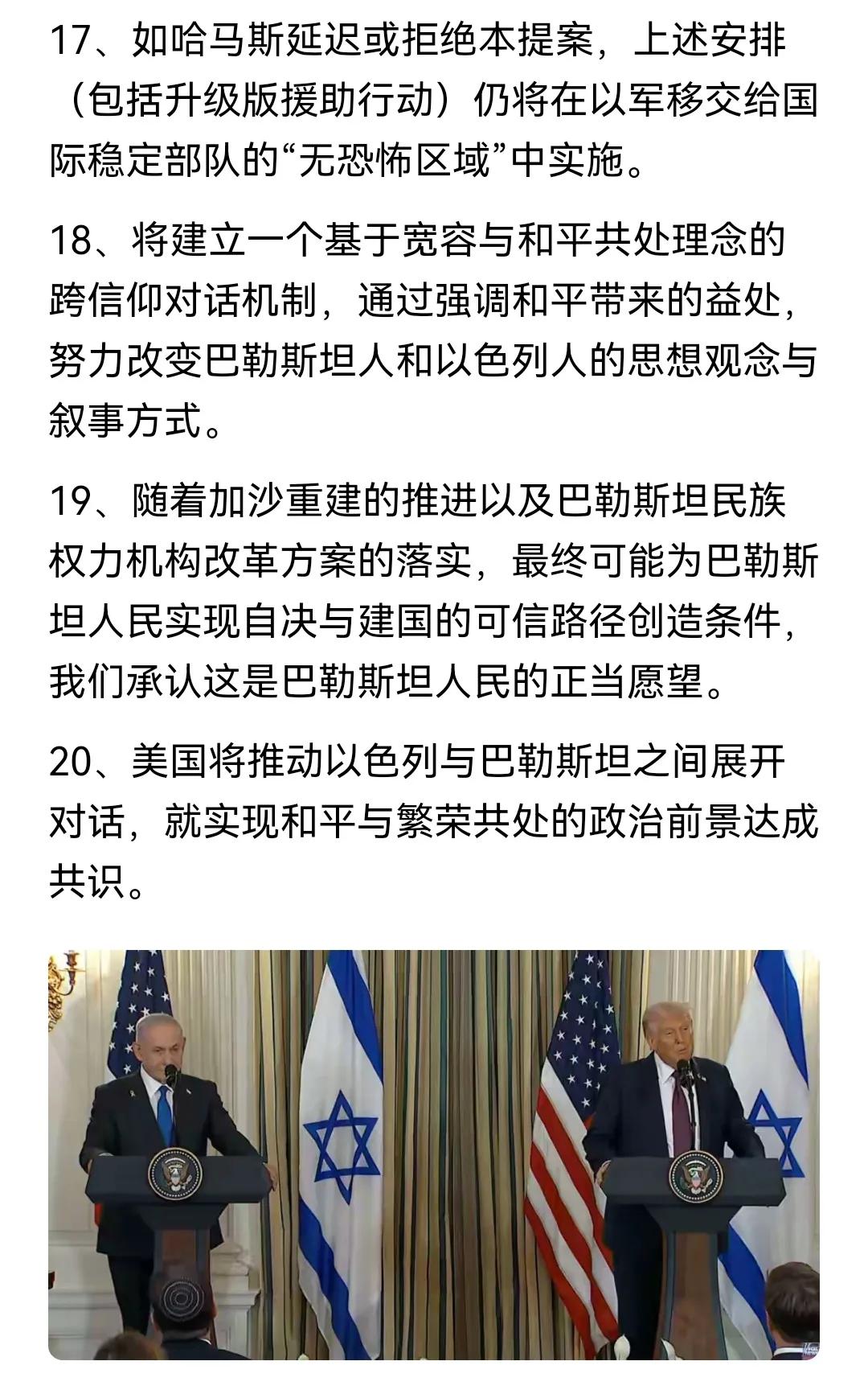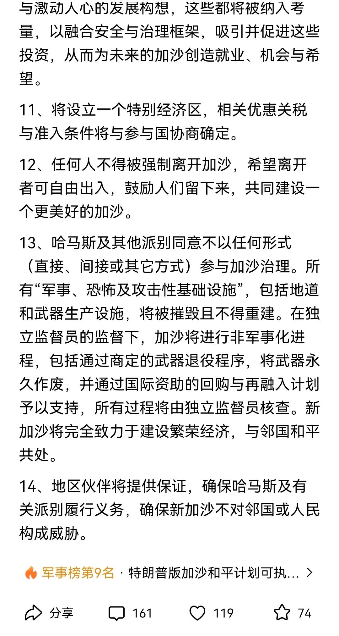 和平和独立是祈求不来的,是斗争得来的,巴勒斯坦人民当然不能轻易放下武器,但斗争应该有策略。 哈马斯可以考虑提出三大要求,来回应美国提出的的20点全面计划。 第一、同意释放人质,条件是停火,同时立刻进行人道主义援助,并且明确加沙种族灭绝罪的调查时间表。 第二、同意不参与将来巴勒斯坦的行政治理,条件是以色列承认1967年边界。 第三、同意放下武器和解散,条件是以色列承认巴勒斯坦国。 如果以色列都答应,为了巴勒斯坦的未来,哈马斯最终解散也是赢了。如果以色列不答应,就进一步暴露他们犹太人的本质。