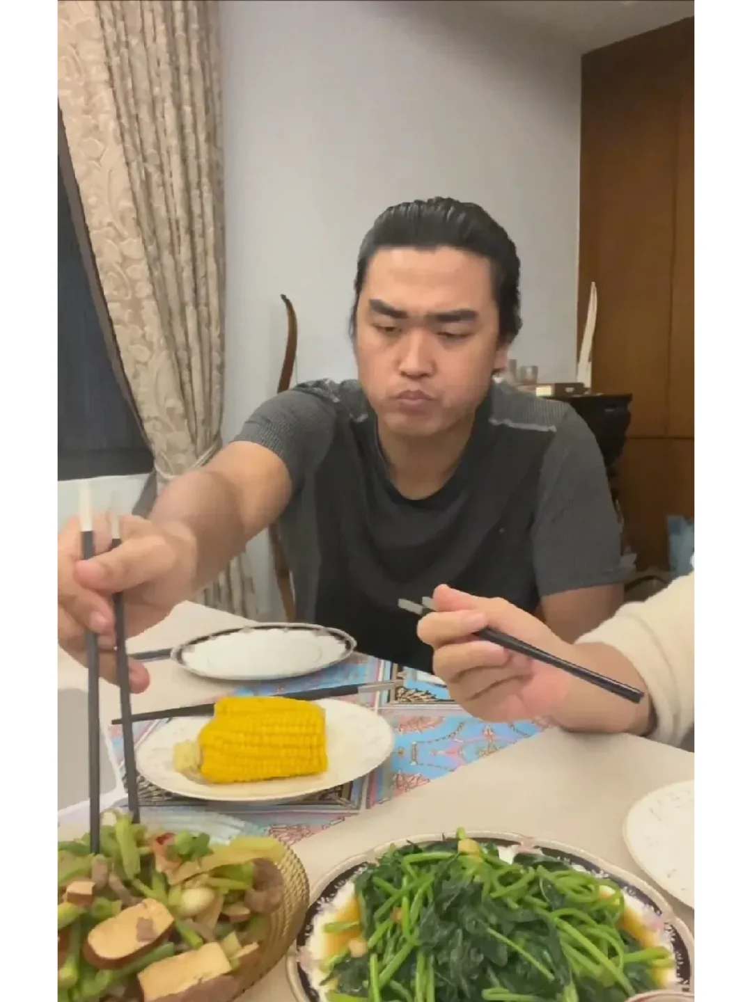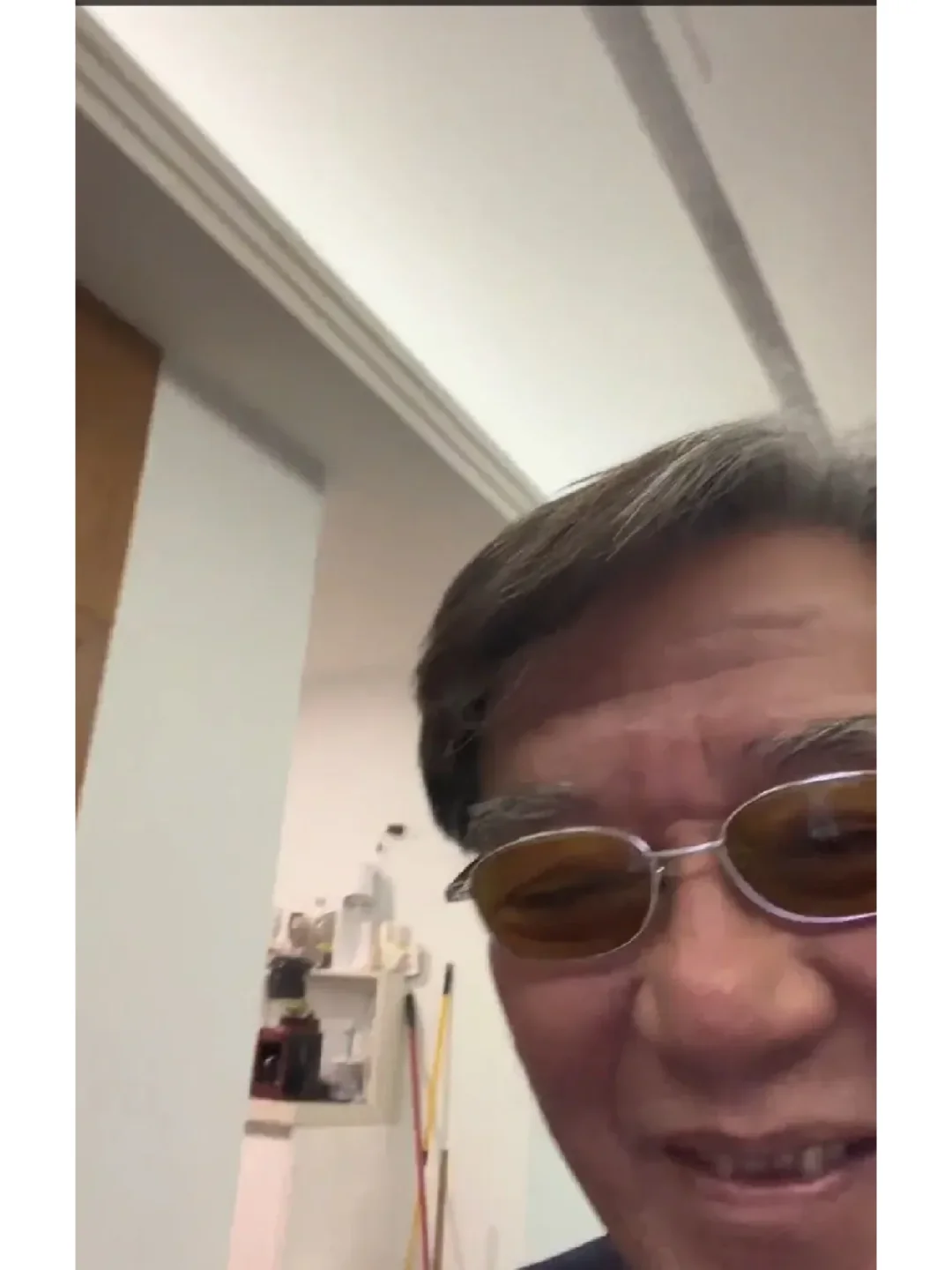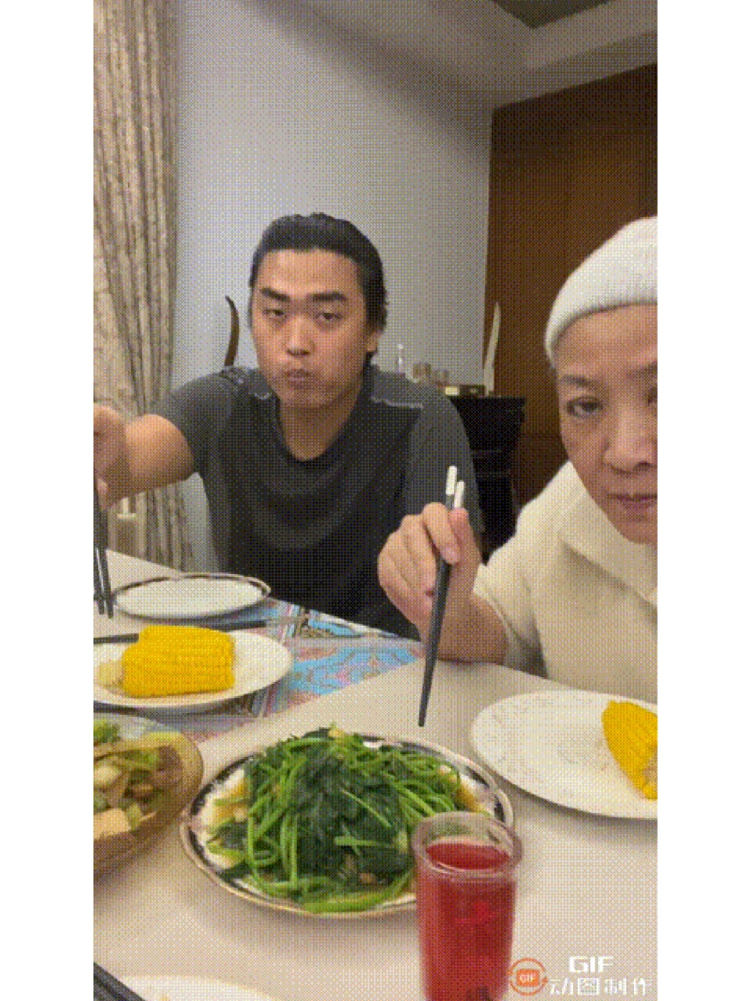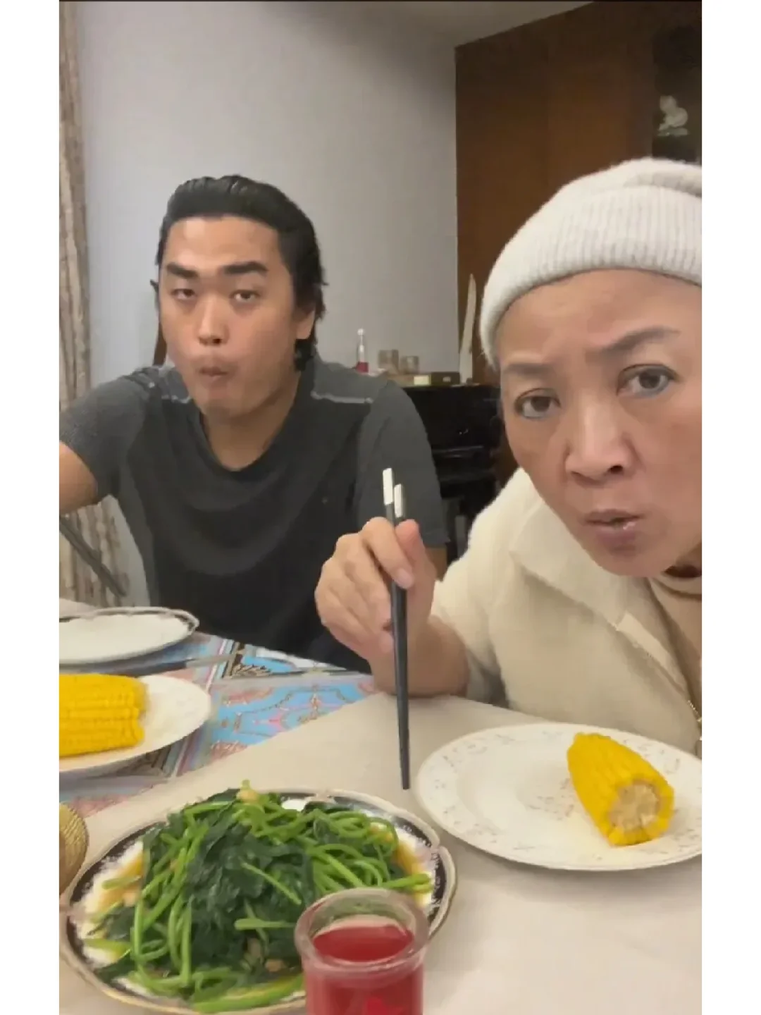 吃晚饭时,李立群老爷子拍视频,拍完了自己又拍了老婆和儿子,不料儿子看镜头时感觉特别不友善,眼光看起来有点凶。
