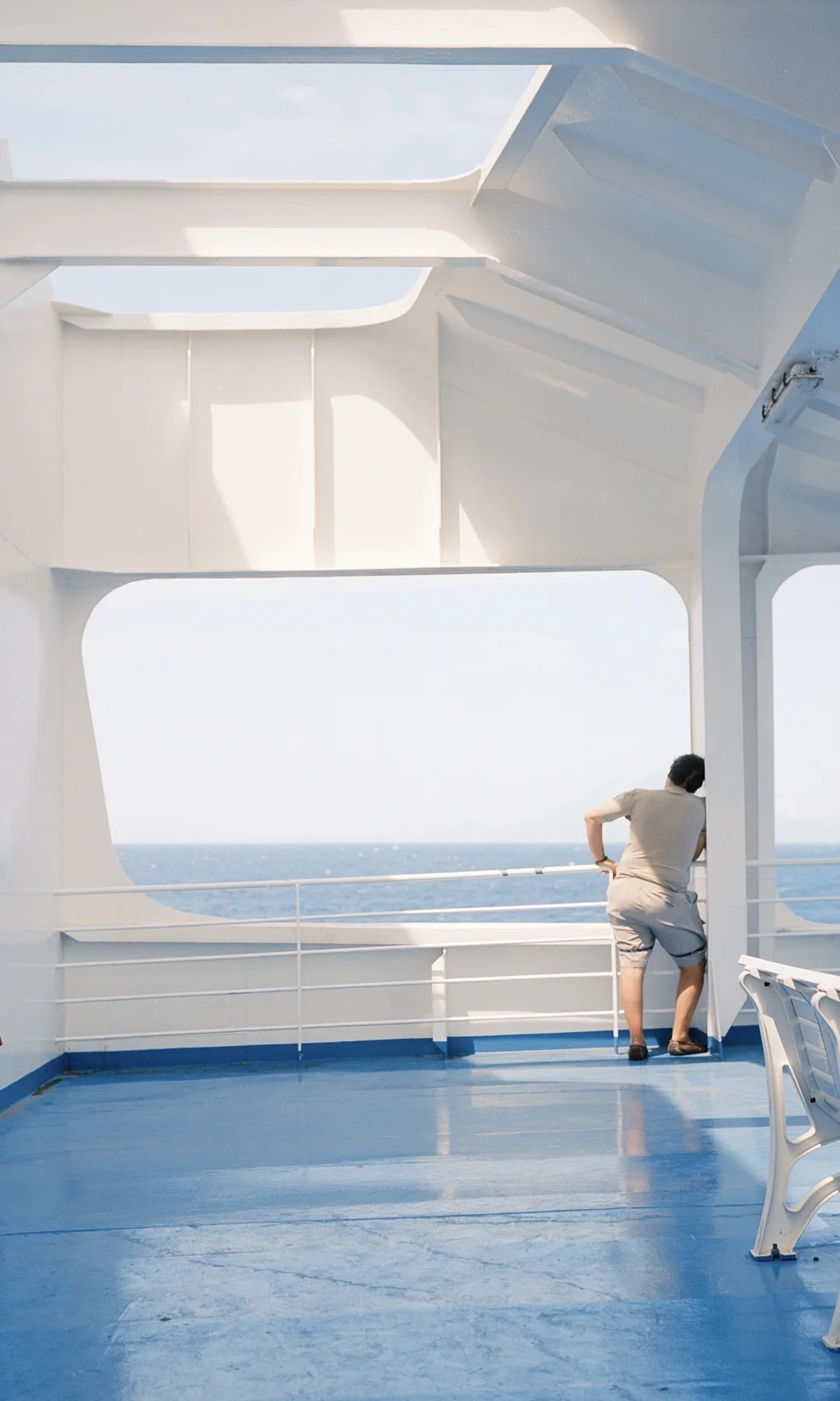 手里提着行李,眼前是不断变化的海岸与天空