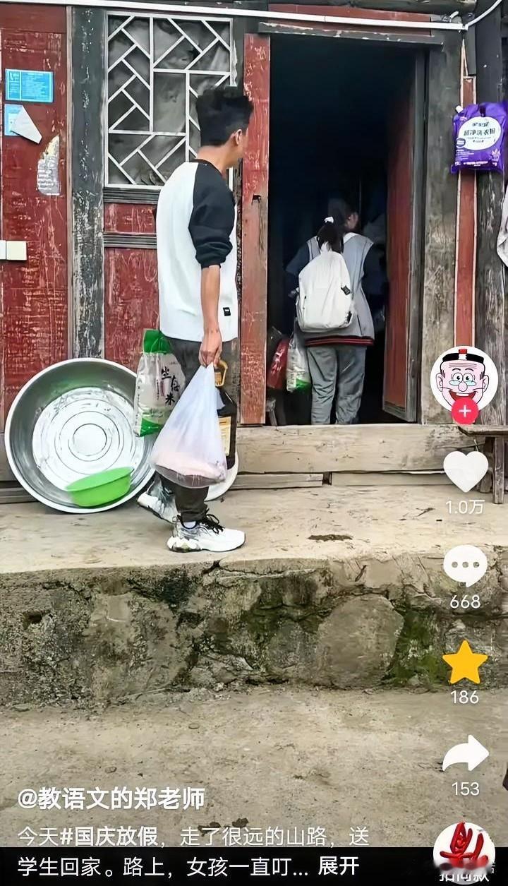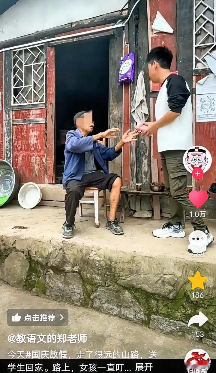 近日,贵州遵义。国庆放假期间,一名老师送学生回家,他们走了很远的山路。路上不好走,女孩一直叮嘱老师小心路滑。 走了不知多久,女孩指着远处的老木屋——那就是我的家。老师发现木屋很旧了,却收拾得干干净净,学生与86岁的爷爷相依为命。 爷爷了解来意后,颤巍巍地捧着自己捡来的板栗。那些板栗很小,有些还被虫蛀过。爷爷俯下身子,细心地挑出一颗颗最饱满的栗子。 爷爷流着泪说:“我今年生了一场大病,不知道还能陪她多久……”他看着孙女,混浊的眼睛里全是牵挂。电灯在屋顶轻轻摇晃,那是屋里唯一的电器,还有那个用了多年的电饭煲。 老师一阵心酸,便留下2000块钱。爷爷枯瘦的手一直推拒着,说啥也不肯要。老师解释说,孩子还小,以后用钱的地方还多。老师把钱硬塞到老人怀里,他才颤抖着收下,像接过一份沉甸甸的托付。 老师离开时,爷爷执意让学生送他到村口。学生默默地跟在老师身后。他走到拐角处,回头望去——老人还站在木屋前,用力挥着手,单薄的身影在大山的映衬下,那么小,却又那么坚定。 学生把袋子里的板栗递给老师,红着脸解释说 :“老师,这是我们家最好的东西了。” 老师表示,他知道,这是一位86岁老人能给出的全部了。这些从屋后树林里一颗颗捡来的板栗,比任何昂贵的礼物都珍贵。板栗沾着山里的露水,带着手掌的温度,是一个风烛残年的爷爷,对孙女的未来能做的全部托付。 回城的路上,老师紧紧地抱着这袋板栗。大山深处的贫穷是真的,但比贫穷更坚韧的,是那份在艰苦生活中依然保持的尊严与干净,是爷爷藏在板栗里沉甸甸的爱。 就像那些生长在石缝里的板栗树,再贫瘠的土壤,也能结出最甜的果实。而教育,或许就是照亮这片深山的光——让孩子知道,山路尽头还有更广阔的世界。 老师说,这个秋天,他收到了一份最珍贵的礼物。它让我更坚定:每个孩子都值得被温柔托起,哪怕要翻过最险峻的山,走过最漫长的路。 看完视频,被这份双向奔赴的善意感动了。 这位老师的做法,藏着最实在的温柔。放假不忙着休息,反而绕远路送深山里的学生回家,明知山路难走也没打退堂鼓,最后还留下2000块钱——这哪是普通的师生情,更像把学生当成了自己的孩子疼。尤其看到学生和爷爷住破旧木屋却收拾得干干净净,没嫌条件差,反而记挂着爷孙俩的难处,这份细心和善意,比钱更让人暖心。 爷爷的举动,又让人心里酸酸的。86岁还得照顾孙女,生了病怕陪不了孩子多久,明明过得不容易,却把捡来的、甚至被虫子咬过的板栗送给老师。在老人眼里,这袋板栗不是不值钱的东西,是他能拿得出手的“最好的谢礼”。穷日子里的这份真心,没掺一点虚的,比任何贵重物物都重。 说实话,这事儿最能打动人的,是“双向的真心”。老师给的2000块,是帮衬爷孙俩的实在;爷爷给的板栗,是老人家掏心窝的感谢。 有时候,善意就是这样,不分钱多钱少、东西好不好,只要是真心换真心,哪怕在难走的深山里,也能暖到人心里发甜。这份相互体谅的温柔,比什么都珍贵。(来源:教语文的郑老师)