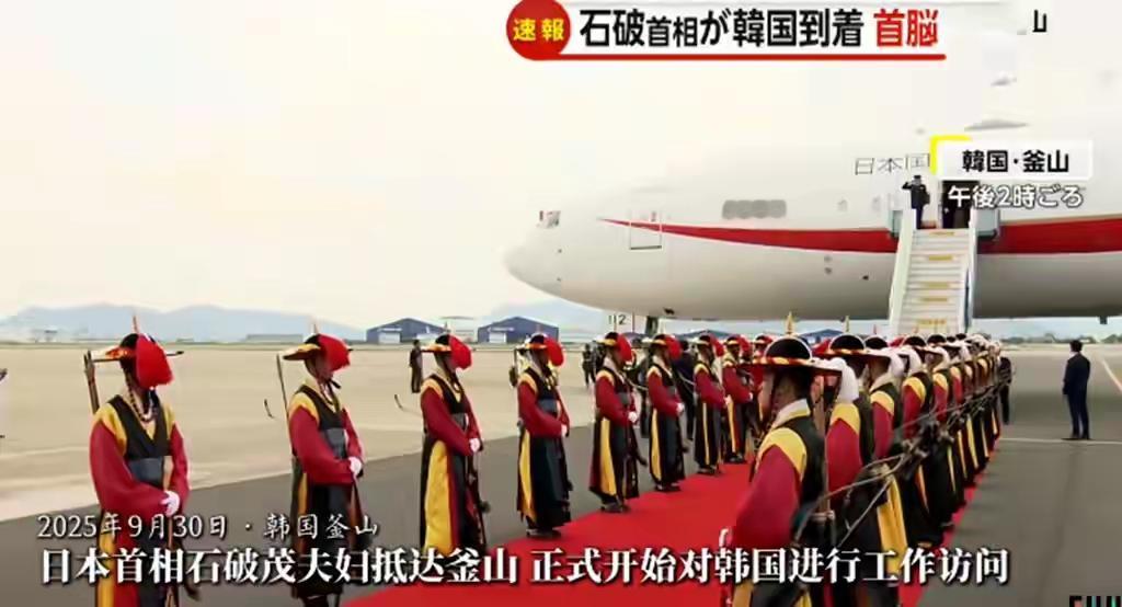 日本首相石破茂访问韩国,这是石破茂当首相的最后一次外访,还有三天石破茂就要卸任啦。 韩国总统李在明为其举行了隆重的欢迎仪式,机场铺设了长长的地毯,可见韩国对日本首相石破茂的重视,参加仪式的韩国工作人员穿上了传统服饰,列队欢迎石破茂。