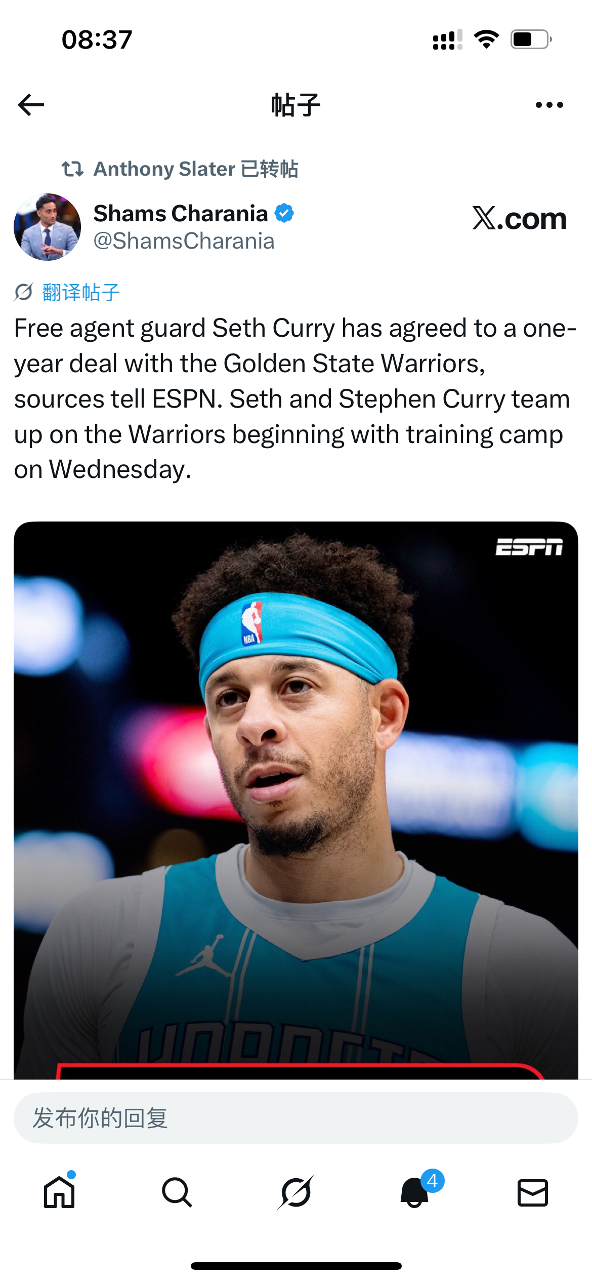 塞斯库里也一年合同签约勇士