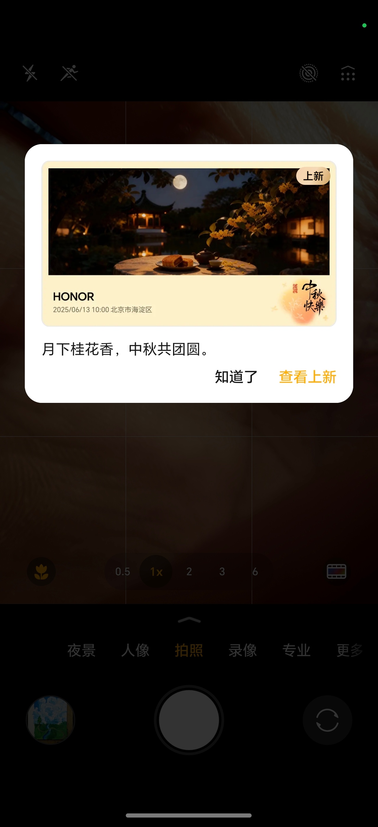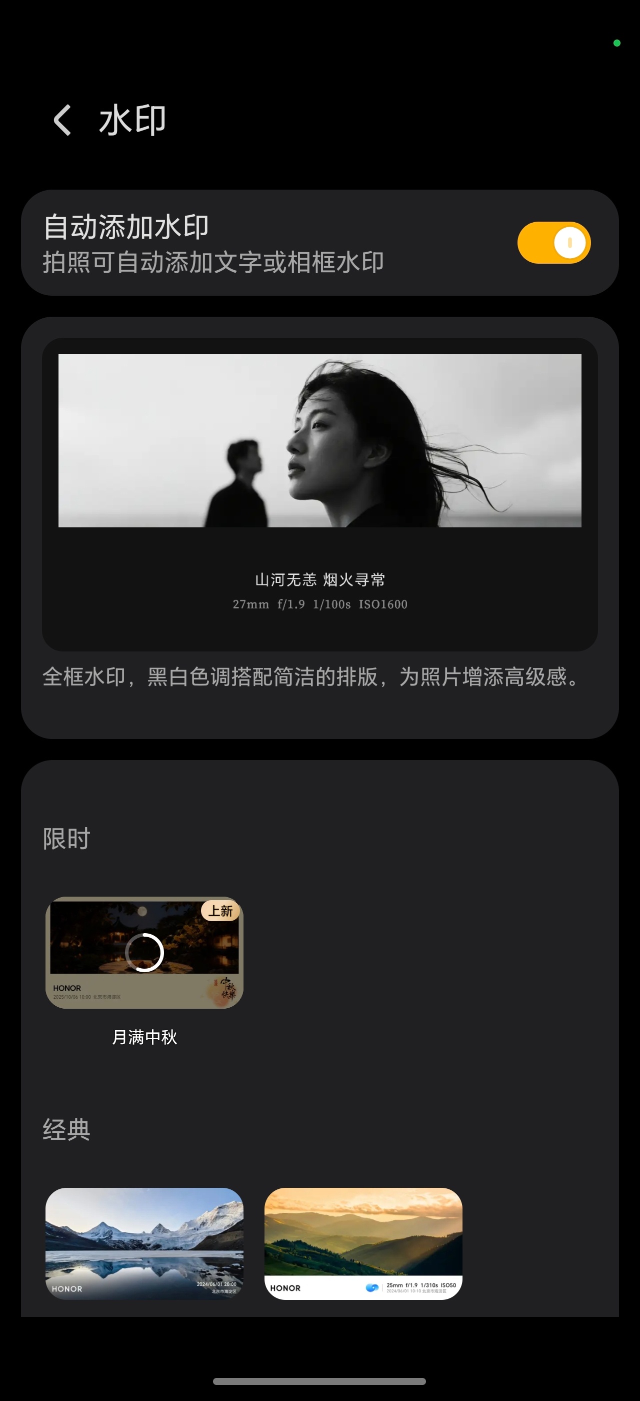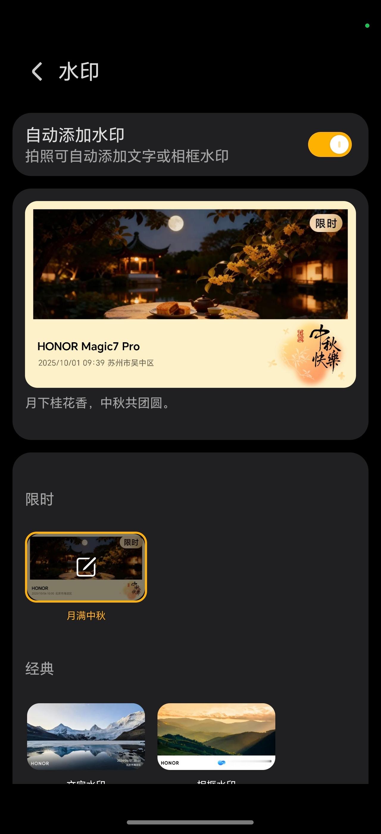 荣耀手机的中秋节水印上新,看起来还不错,已经设置好,坐等出片。祝大家国庆中秋双节
