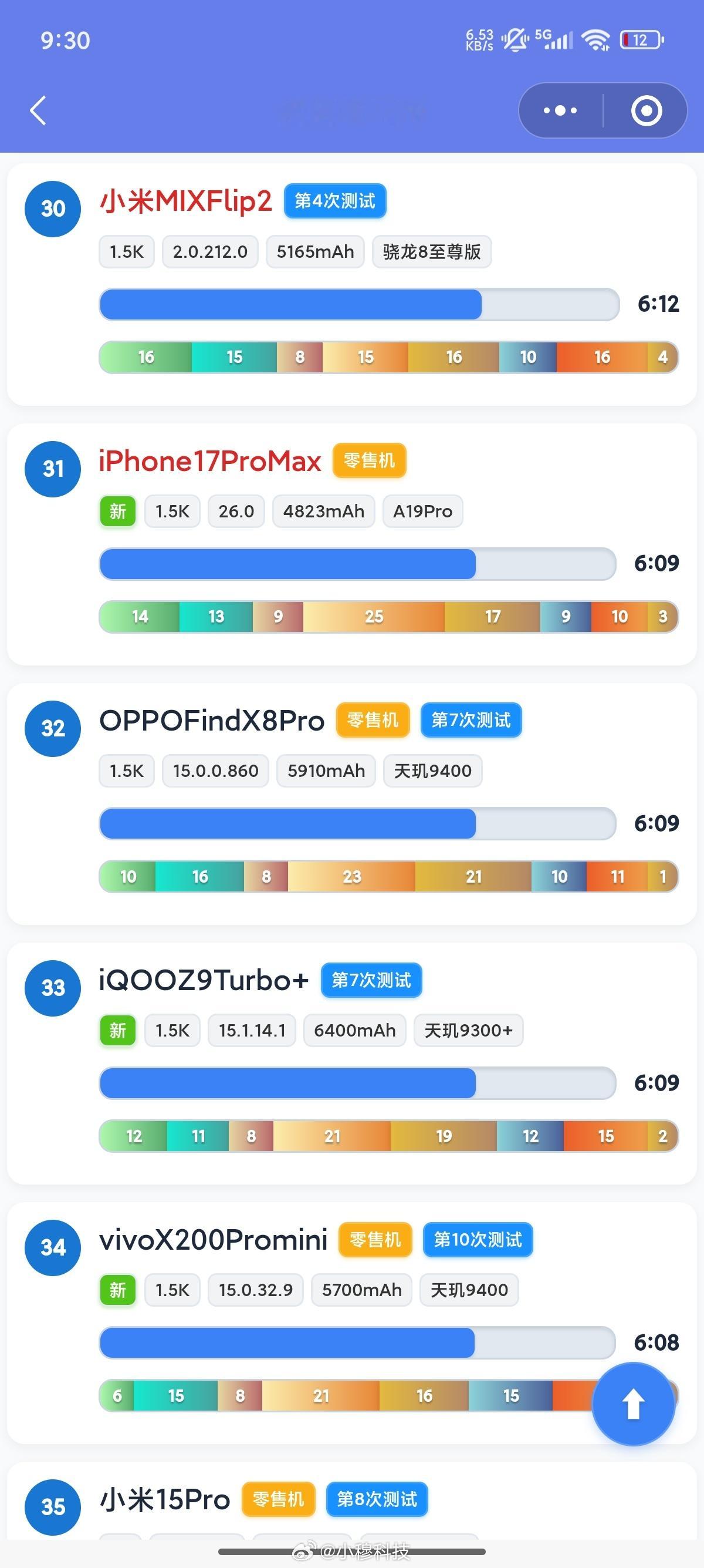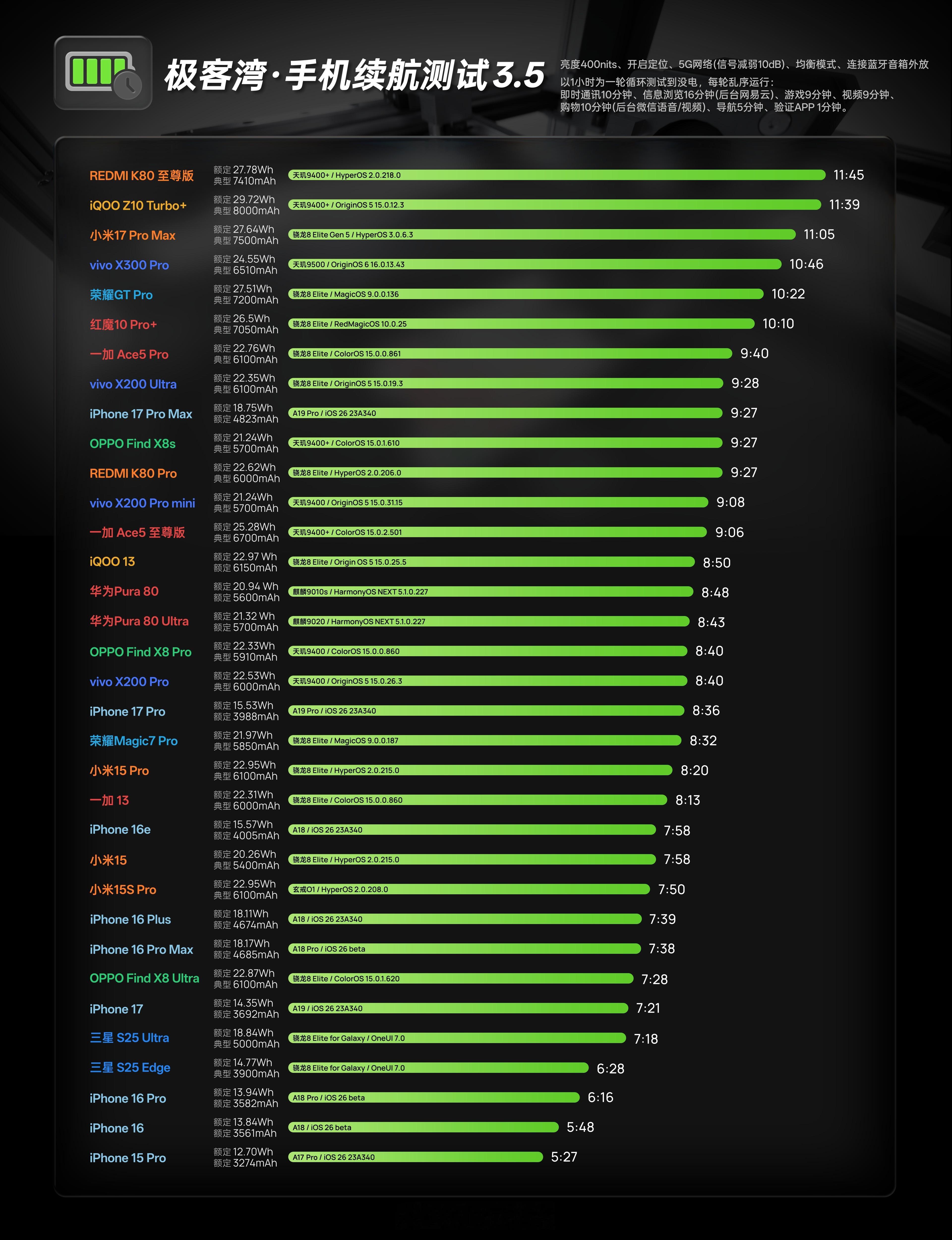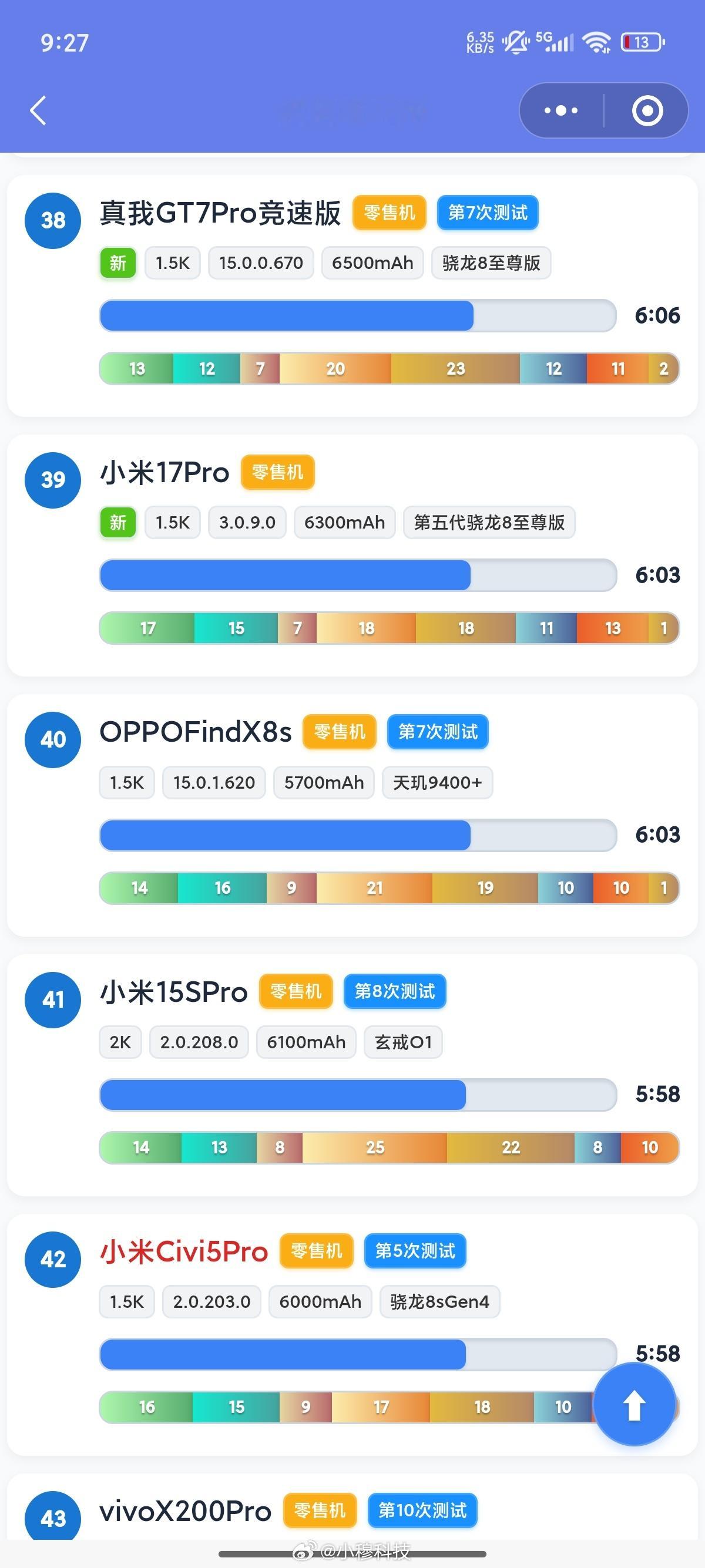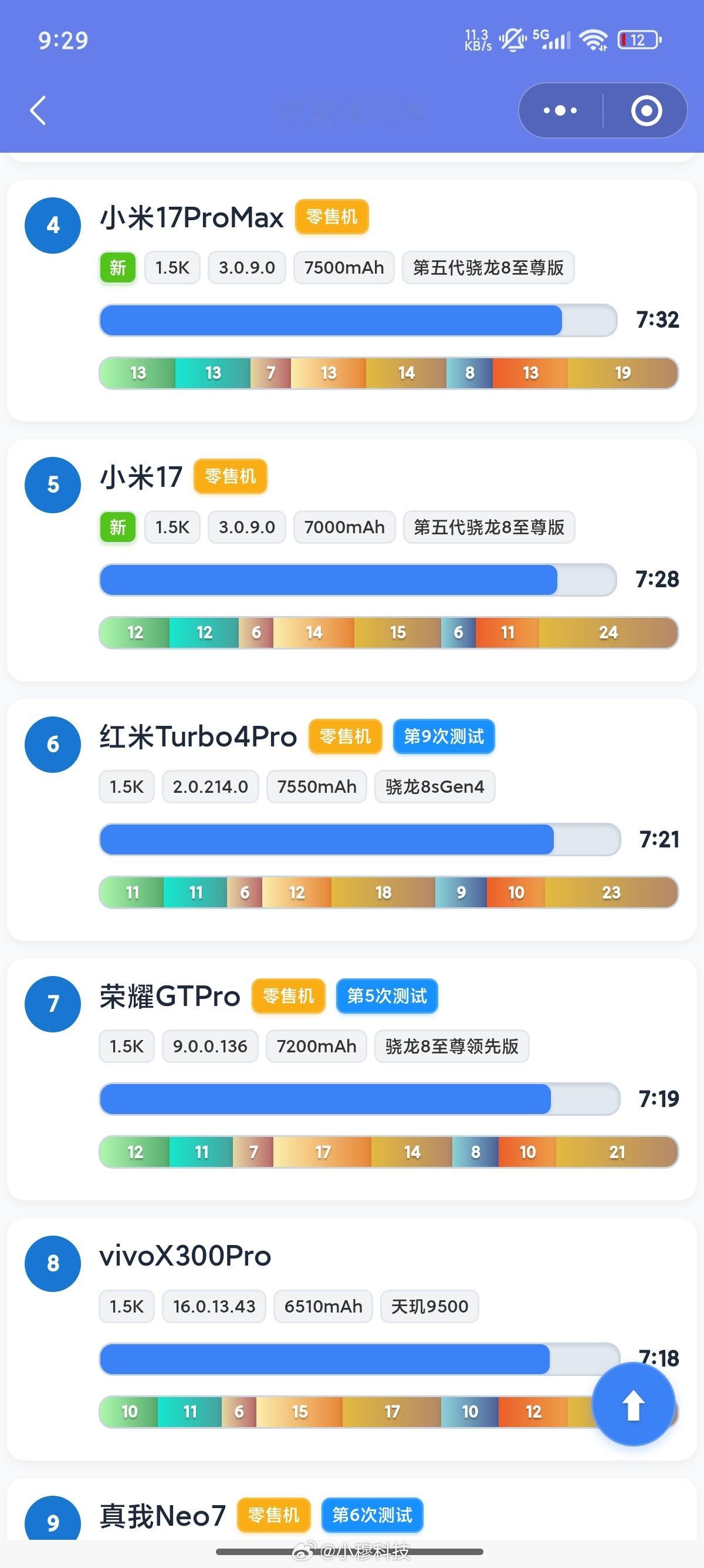 但是小米17Pro在安卓旗舰中要弱一些,尤其是和天玑9500/9400的同规格机子比,不清楚是骁龙8eg5功耗偏高还是澎湃OS3的问题,由于目前只有小米17一个骁龙8eg5系列发布,还不清楚具体原因,等待后续其他家新机发布对比就知道了,大家选择新机是看电池大小还是续航多少?[吃瓜]