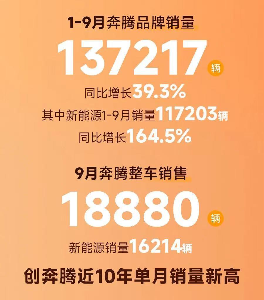 【创10年单月新高!一汽奔腾9月销量超1.88万辆】日前,一汽奔腾官宣:今年前9
