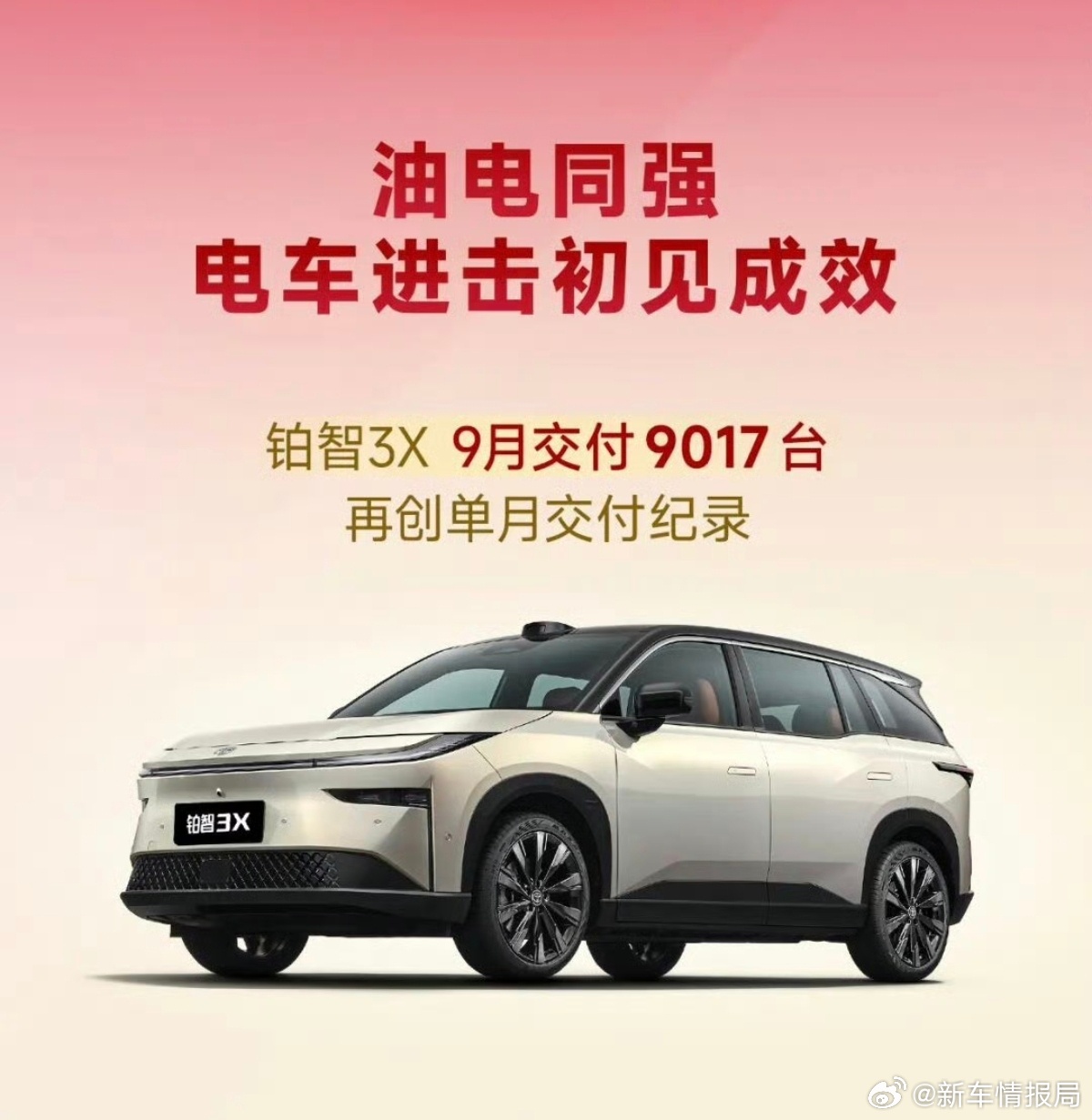 铂智3X车型9月交付9017台 刚刚,广汽丰田公布了9月销量共71220台,其中铂智3X车型9月交付9017台。新车情报局