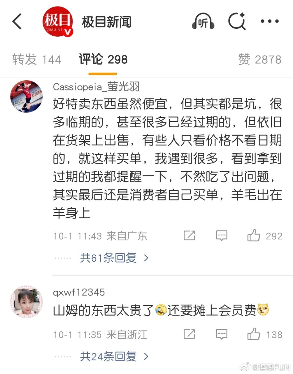 山姆99.9元零食 好特卖39.9二者没有可比性,疑似好特卖的广告。一个临期产品贩子怎么能和户晨风口中的山姆会员店媲美?所以网友都有两种观点,一个说好特卖临时多甚至过期也有,一个说山姆会员店太贵还要会员费。