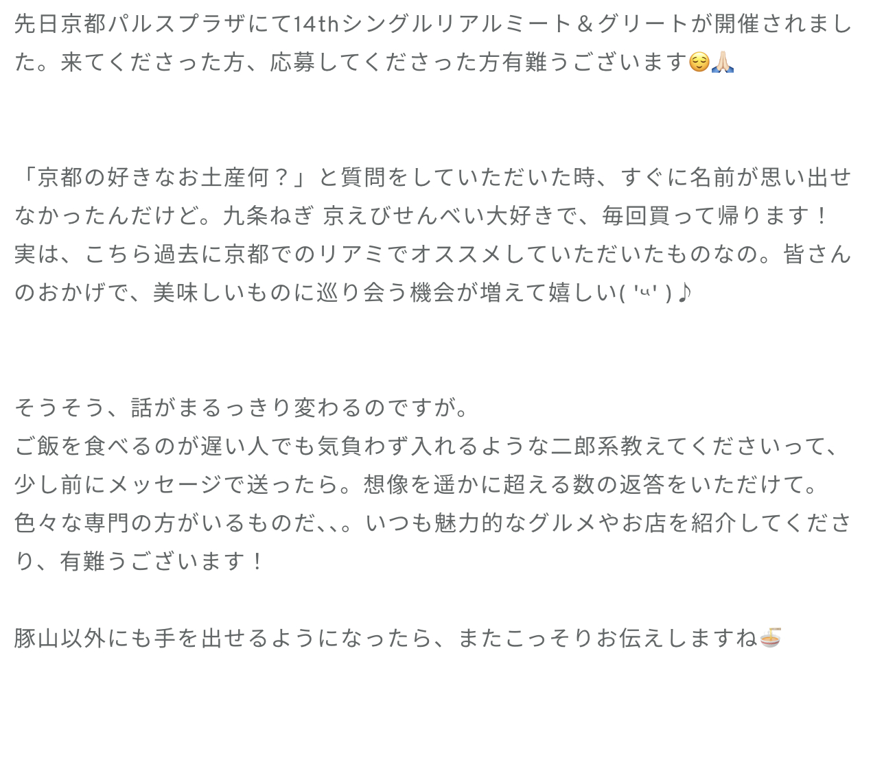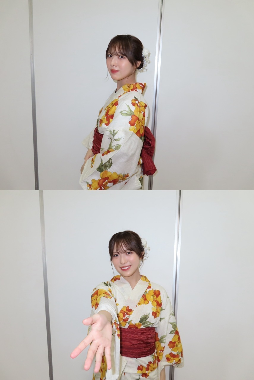 まりぃちゃん「そうそう、東京でのリアルミーグリに続き京都でも浴衣を着ました!オレンジ色テーマのものを着ていくと書きましたが、ちょっとオレンジ要素弱めでしたね。許して( ᵒ̴̶̷̤ ᵒ̴̶̷̤ ) 皆さんのおかげで、風物詩をより楽しめています。」