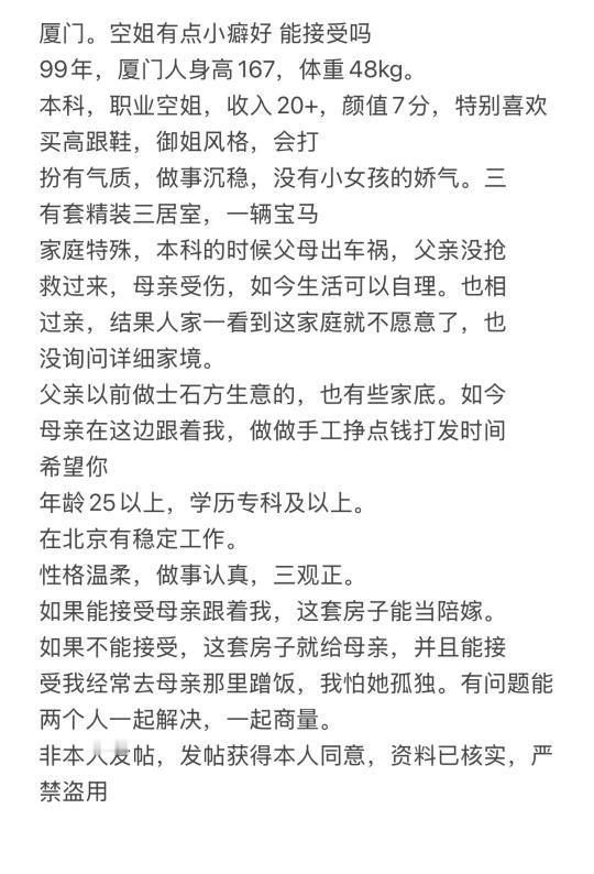 厦门空姐有点小癖好 能接受吗 厦门 非本人征婚,个人资料已核实,并已获得本人授权发布,严禁盗用