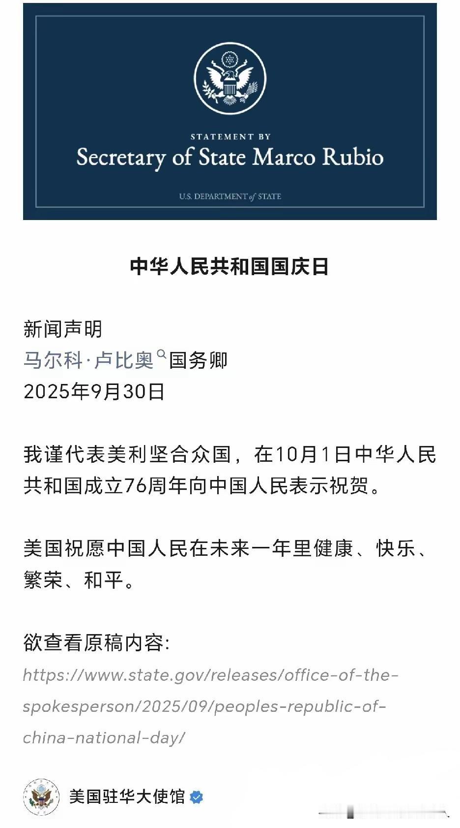 美国国务卿鲁比奥在中国国庆节之际发表声明:我谨代表美利坚合众国,就中华人民共和国