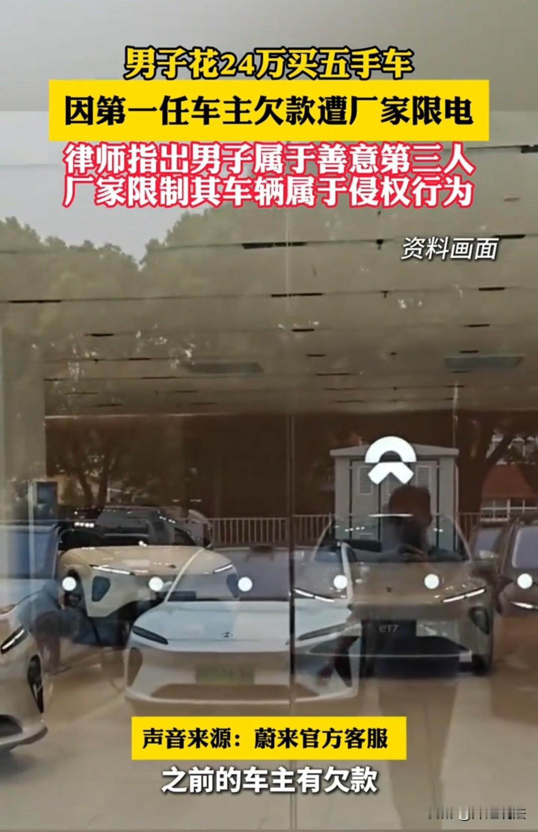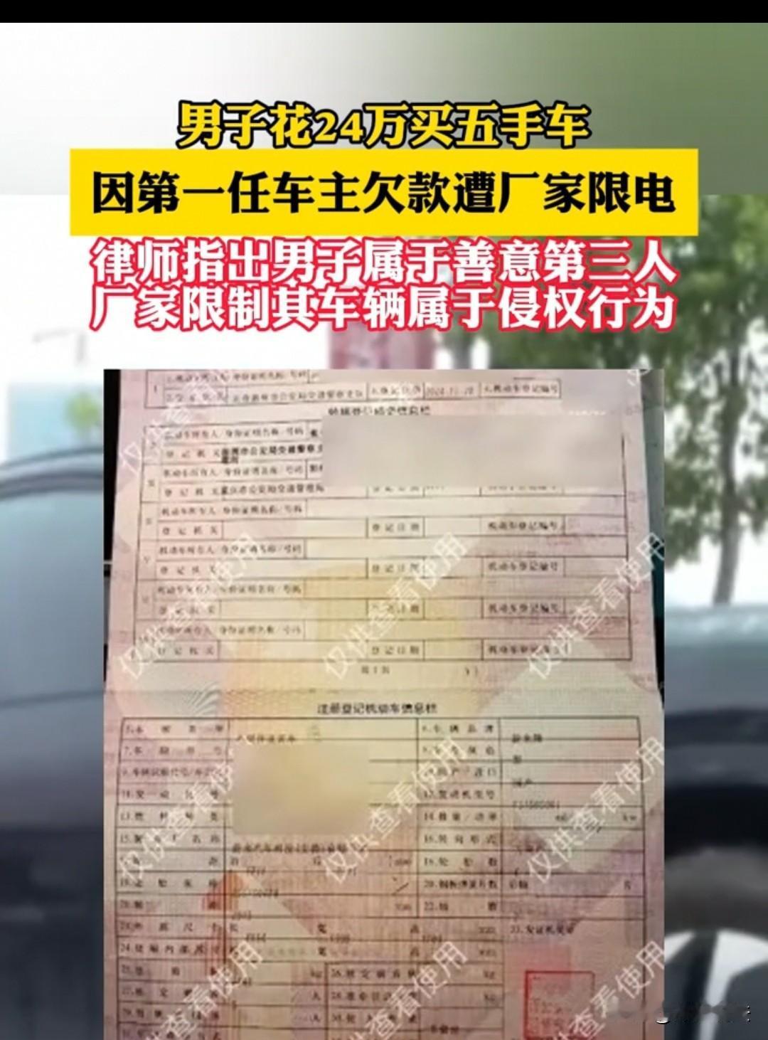 第一任车主不还贷,第五任车主被远程限电,你说冤不冤?重庆,有个男的车子突然抛锚,联系厂家,对方说就是我们给你断的电,你没交车贷。男的郁闷了,我是第五任车主啊,哪来的车贷?我可是花24万全款买的车。对方说那是第一任车主没还。男的急了,那关我啥事?你该去找第一任车主啊。对方却说没办法,规定就是这样,不还车贷就只能限电。男的怎么据理力争都没用,最后也泄气了,说自己花24万完全买了个寂寞,这不是闹着玩嘛。 素材来源于:零度时评 之前谢先生去逛二手车市场,一眼看上辆蔚来SUV,越看越喜欢,越试越想买,最后花24万拿下了。 要说这24万都能买辆新车了,可他就是跟这车有缘分,看见就挪不开眼,非得买下来才舒服。 买回来后,谢先生天天开,用了半年车子都好好的,他觉得这钱花得值。 后来有朋友喊着去自驾游,谢先生特别高兴,开着车就一起去了。 从重庆到广州路程远,谢先生每次都把电充满,就怕拖大家后腿。 可就算这样,事发当天车子开着开着就没电了,车上所有按键怎么按都不管用,用钥匙启动也不行。 谢先生心里别提多失落了,咋回事啊?之前之后都没事,偏偏自驾游的时候掉链子,多少给点面子啊。 可车子跟钉在那儿似的,稳如泰山,说啥也不动。 谢先生没辙,赶紧给厂家打电话,对方倒实在,说你车子没毛病,是我们远程给你限电了。 谢先生又惊又懵,好端端的,你给我限电干啥?我还在自驾游呢,赶紧给我恢复啊! 对方不客气地说,这车的车贷没还,你凭啥让我们恢复供电? 谢先生这才反应过来,这不是我的问题啊!我花24万全款买的,你说的是谁没还车贷?是不是第一任车主? 客服说确实是第一任车主没还,所以这车暂时不能用,得等对方还了车贷才行。 谢先生觉得对方不讲理,第一任车主欠你钱,你找第一任车主去啊,找我干嘛?我都是第五任了,中间隔了好几个人,你咋就不明白呢? 而且我是正规过户,车子早就在我名下了,你们之间的矛盾不能扯到我身上吧? 可对方直接回了句,车子是你的没错,但车机系统是我们的,我们就是能给你限电。 谢先生这下真是叫天天不应叫地地不灵,彻底没辙了,这事儿确实棘手。 他赶紧找去蔚来体验中心,把问题说了,让工作人员帮忙协调,可对方也两手一摊,说没办法,是系统限的电,我们体验中心能有啥办法?你还得直接找厂家。 最后记者帮忙联系上客服,问到底啥情况,按道理说,要是车子办了抵押贷款,根本不能过户啊。 关键是谢先生花24万正常过户,车子都成他的了,凭啥不能正常开、不能用你们的充电服务? 客服查了之后说,第一任车主办的不是抵押贷款,是信用贷,所以车子能正常过户。 记者又跟对方据理力争,你们跟第一任车主有纠纷,就该找当事人,别连累现任车主啊。 要是都这样,谁还敢买你们品牌的二手车?动不动就远程限电。 对方说会马上把情况上报,看看之后能不能恢复供电。 不过记者一直没收到后续消息,谢先生的问题到现在也没解决好。 简单说,厂家压根没资格给谢先生限电,要钱啊就只能找第一任车主,这事儿在法律上其实是说得明明白白的。 首先,谢先生花24万全款买的车,还正儿八经办了过户,这车的所有权早就彻底是他的了。 按《民法典》第240条规定,所有权人对自己的动产——就像就像这车子——享有占有、使用的完整权利,车机系统是车子的一部分,肯定得跟着车子归谢先生用啊。 厂家说“系统是我们的”就断电,本质上就是侵犯谢先生的物权嘛。 再者,第一任车主办的是信用贷,没给车子办抵押登记。 《民法典》第403条也明确说了,动产抵押没登记的,不能对抗善意第三人。 谢先生买二手车的时候又不知情,还是通过正规渠道买的,妥妥的“善意第三人”,厂家根本不能拿前任的欠债找他麻烦的。 厂家和第一任车主的贷款,那是他俩之间的事儿,按“合同相对性”原则,谁欠钱就找谁要去,该协商协商,该起诉起诉,没道理把风险转嫁给无辜的谢先生。 所以谢先生完全能硬气点:依据《民法典》第238条,要求厂家立刻解除限电,还得赔他因为车子用不了造成的损失。 要是厂家不配合,直接找消协投诉,或者去法院起诉就行,没什么好犹豫的。 对于此事,大家如何看?