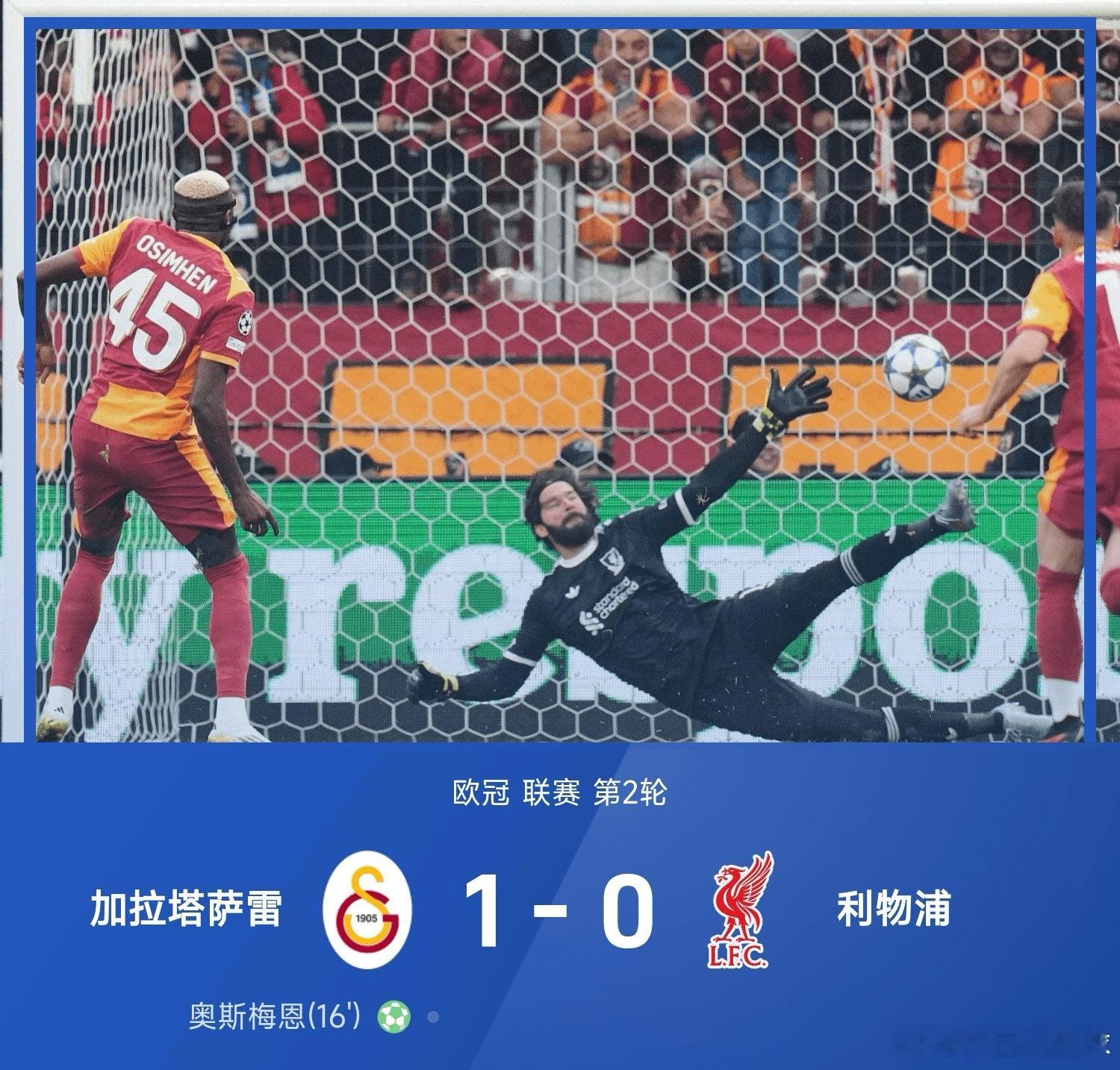 10月1日凌晨3时,欧冠联赛阶段第2轮,利物浦°做客土耳其电信球场对阵加拉塔萨雷°。上半场,索博斯洛伊犯规送点,奥斯梅恩主罚点球命中,加克波错失一次绝佳良机。利物浦半场0-1落后加拉塔萨雷。下半场,阿利森、埃基蒂克因伤被换下。最终利物浦0-1不敌加拉塔萨雷,各赛事遭遇两连败。