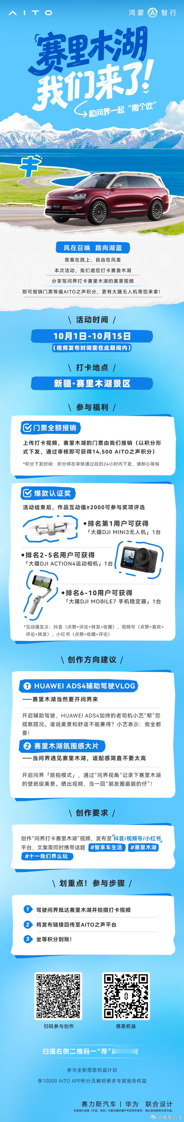 赛力斯鼓励车主多去赛里木湖旅游,并且报销赛里木湖门票。还有鸿蒙智行前段时间把问界M7媒体试驾也放在了赛里木湖,这是真金白银支持车主,并带动当地旅游发展。