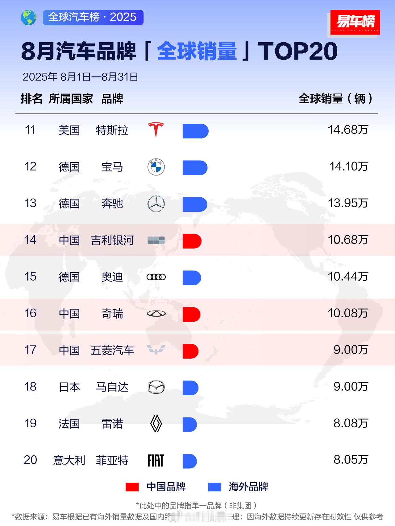 2025年8月全球汽车品牌销量TOP10: