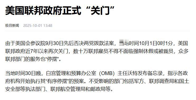 美国联邦政府正式“关门”! 当地时间10月1日零点刚过,因为国会参议院在9月30号把两党提交的拨款法案都否决了,这场早有苗头却还是让人措手不及的政府停摆就这么开始了,而距离上一次那长达35天的政府停摆,刚好过去了整整七年,而且也是在特朗普任上。 大家得知道,美国联邦政府要正常干活,全靠国会通过的年度拨款法案给钱。一旦钱批不下来,除了国防、医疗这些核心关键部门,大部分联邦机构都只能被迫停摆。 而根据白宫管理与预算办公室发的声明,这次停摆直接影响到80多万联邦雇员,其中约40万人得无薪休假,剩下40万干关键岗位的还得接着干活却拿不到工资,这就意味着从国家公园的管理员到食品安全检查员,很多维持社会正常运转的岗位都会缺人。 翻回头看看七年前那次停摆,当时就是因为两党在边境墙拨款问题上互不相让,结果政府一关就是35天,光经济损失就超过110亿美元。 现在历史又重演了,国会预算办公室初步算下来,这次停摆要是持续一周,美国经济至少得损失60亿美元,时间越长,旅游业、签证办理、农业补贴发放这些领域的损失还会跟着扩大。 更让人担心的是,社会服务也极有可能出问题,好几个州的联邦救助项目申请通道都关了,小企业贷款审批也停了,就连全国气象局的灾害预警服务都因为人手不够快撑不住了。 其实说到底,这次停摆的根儿还是两党在预算分配上的分歧太大。 虽然众议院之前通过了共和党提的短期拨款方案,但到了参议院,两党议员都不认可对方的条款,民主党想多给社会福利拨点钱,共和党却坚持要削减非国防领域的预算,两边谁也不让谁,最后谈判就崩了。 明年就要中期选举了,两党在重要议题上的争斗只会更厉害,可最后遭殃的还是普通老百姓。 现在白宫和国会还在紧急商量临时拨款的事儿,但看以前的情况,想打破这种僵局可不容易。那80多万联邦雇员只能着急地等着消息,不少人已经开始用自己的积蓄过日子了。 这场政府关门的风波到底会持续多久,又会给美国社会带来哪些连锁反应,现在谁也说不准,只能等时间来告诉我们答案了。
