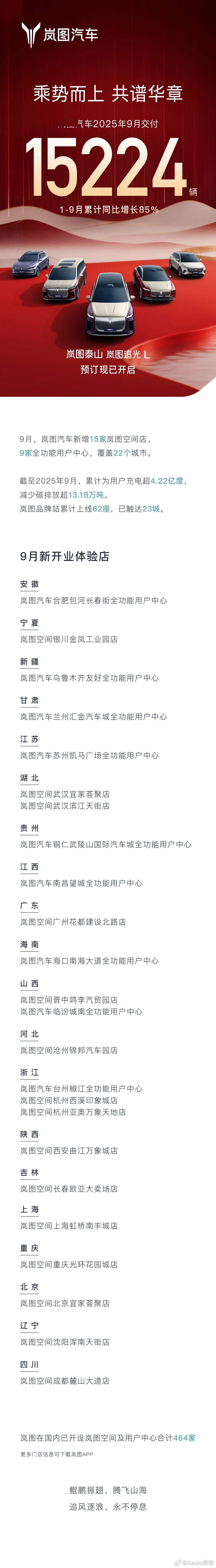 9月,岚图汽车新增15家岚图空间店9家全功能用户中心,覆盖22个城市。截至2025年9月,累计为用户充电超4.22亿度减少碳排放超13.18万吨。岚图品牌站累计上线62座。