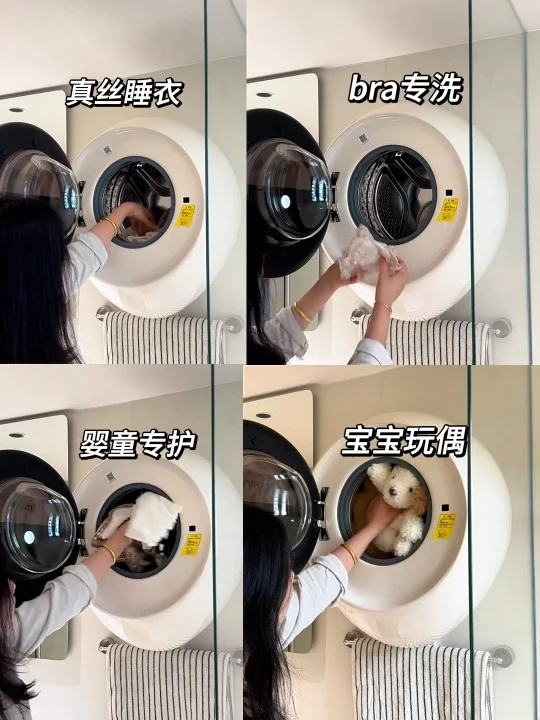我自己的bra、真丝睡衣也能放心洗👗bra专属程序洗出来不变形,低温护烘能把真丝烘得软乎乎,不像以前洗完还要跑到阳台去晾,自带的桶自清洁功能更贴心,每次洗完自动清洁内筒,避免细菌残留,孩子和大人的衣服哪怕分开用它洗,也不用担心交叉污染。