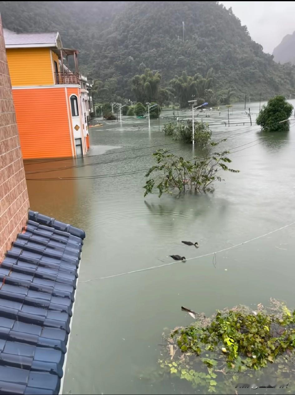 广西果然好山好水,第一次看到发洪水这么清的,山上植被好,流下来的水都是清的,所以有时没那么浑! 拆散那两只鸭,看不惯它俩那么舒服,鸭子可开心了,游泳池变超大超大。家都被淹了,两只鸭子还在那里悠闲自得的玩水。 广西就是不一样,发洪水水都是清澈绿的。其他地方的都是红的。水已经清成这个颜色了,看篮球框那对比还这么深,这损失绝对惨重!不过广西人一向乐观