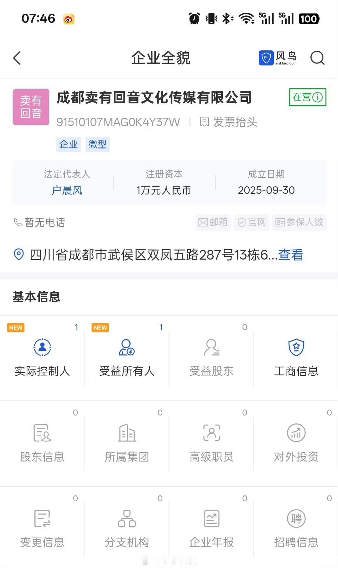 户晨风户晨风昨天账号被全网注销,但是他之前申请的公司也在昨天通过审核成立了,叫成都卖有回音文化传媒有限公司,大家觉得这是巧合还是有意的[思考]