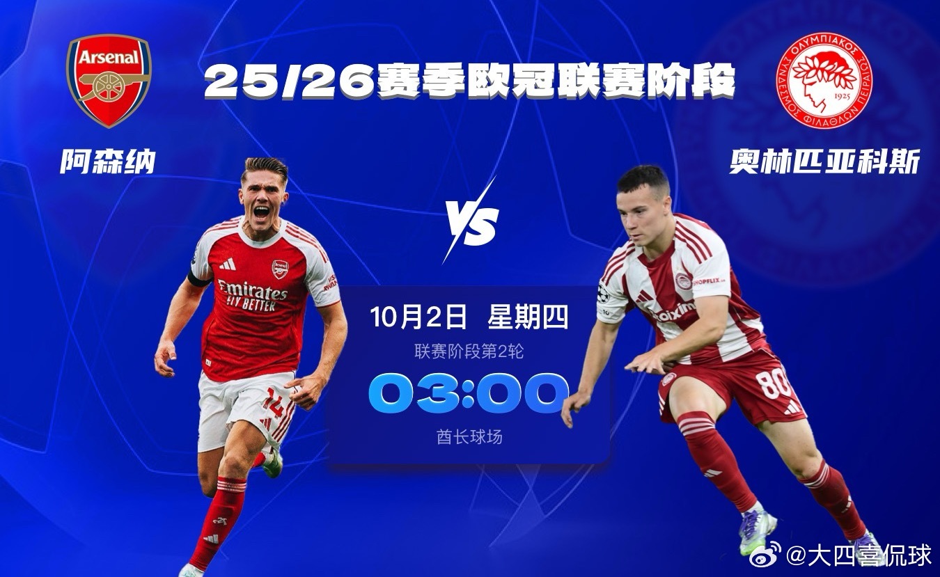 10月1日讯 北京时间2日凌晨3时,欧冠联赛阶段第二轮,阿森纳将主场对阵奥林匹亚科斯。