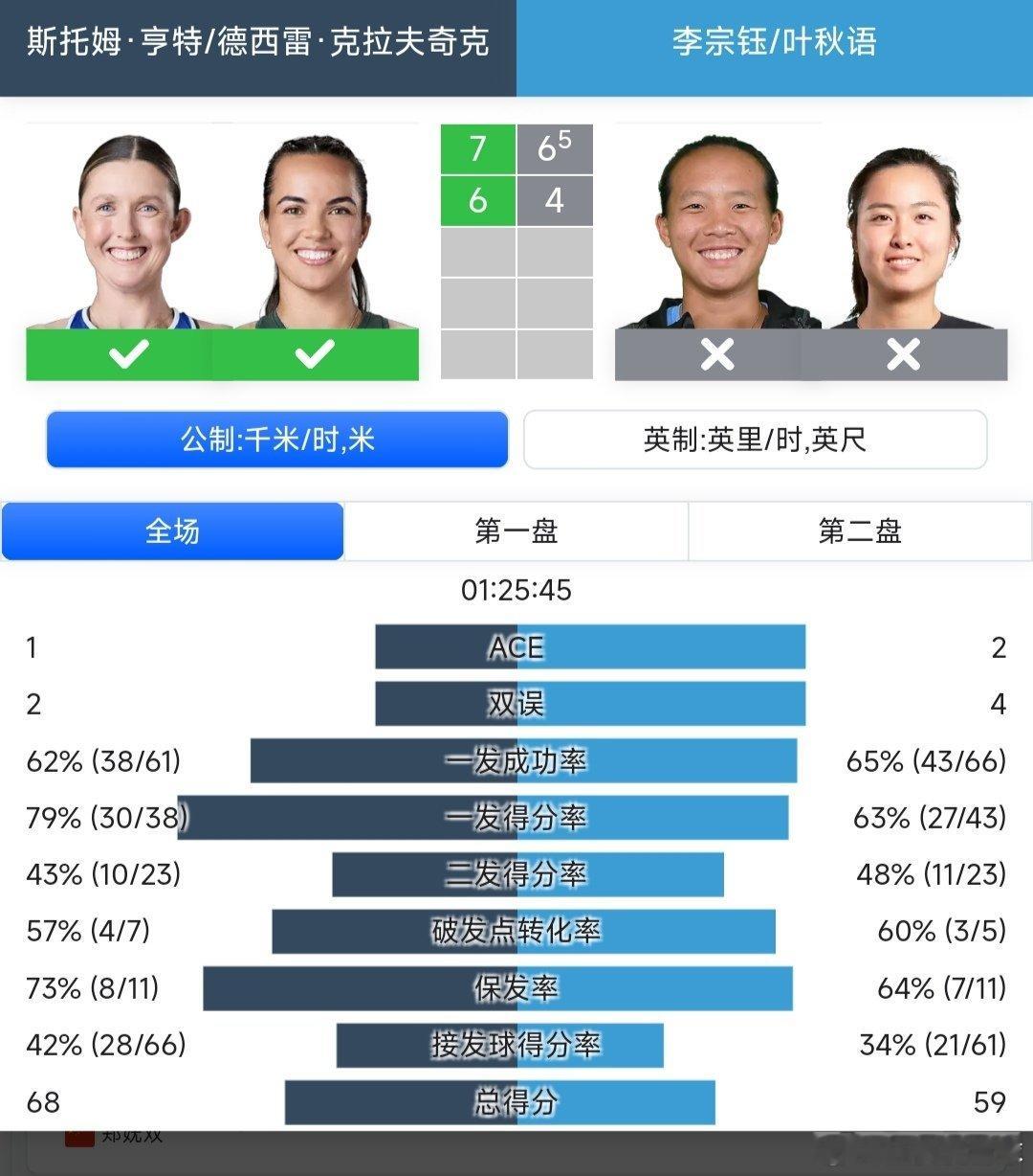 李宗钰🇨🇳/叶秋语🇨🇳6-7(5)/4-6不敌头号种子亨特🇦🇺/克拉夫奇克🇺🇸,无缘半决赛。