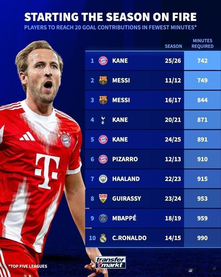 梅西年度91球记录要被打破了,凯恩打破巅峰梅西最快制造20球记录! 本赛季凯恩开挂了,9场比赛打进17球还送出3次助攻,合计参与制造了20球,却仅仅只用了742分,打破了巅峰梅西在11-12赛季创造的749分钟参与制造20球的记录。 11-12赛季是梅西职业生涯的巅峰,梅西在巴萨打进71球送出31次助攻,年度打进恐怖的91球,现在凯恩的进球效率超过了梅西,有望打破梅西91球记录。 巧合的是姆巴佩也超越了巅峰C罗的进球效率,看来本赛季姆巴佩要和凯恩上演巅峰对决了。