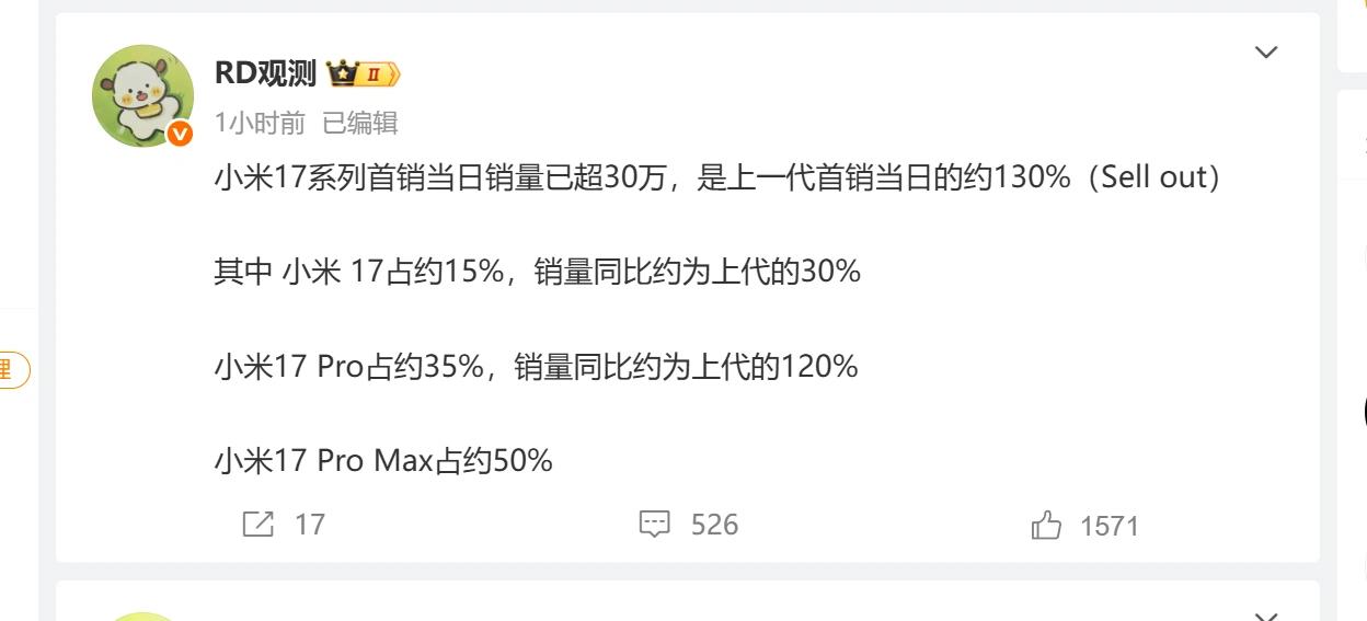 小米手机首销成绩出来了。首日激活量30w。 对比15系列首日激活量提高30% ,但是标准版GG了,15系列是9天激活量破百万,一直到今年7月份旗舰机激活量才被mate70系列激活量反超,所以17系列可能激活破百万的速度和生命周期应该都要高于15系列销量。