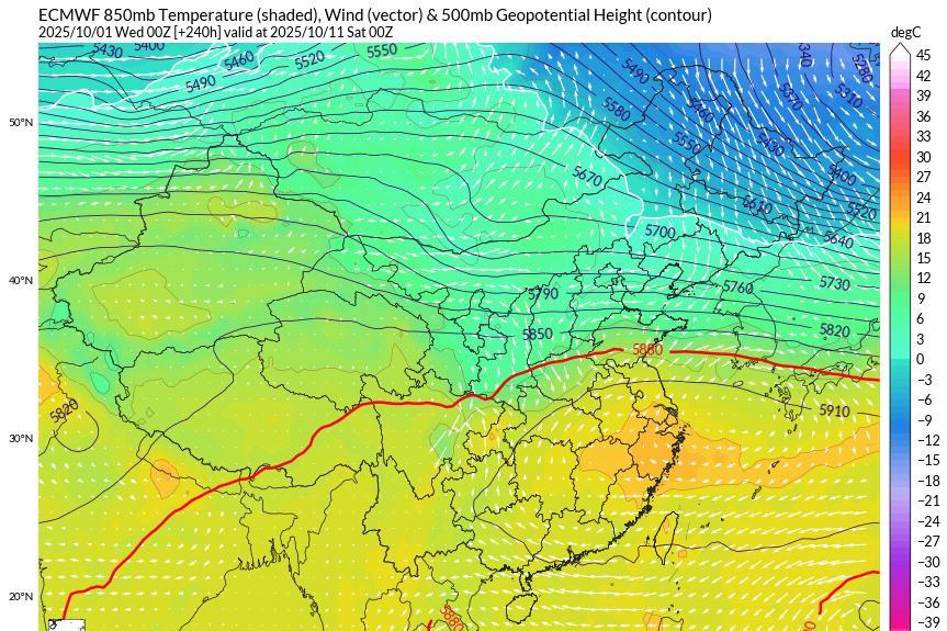 国庆假期后半段的冷空气已经大幅调弱了,并且南下程度相当有限,目前来看最南也就到淮河流域,长江以南地区可能都没啥感觉。不过这股冷空气对副高的影响还是有的,副高强度会减弱一些,南方高温范围和强度都会小一些。单从形势场预报上看,南方橙色区域可以大致看作是高温范围,7号的冷空气过后橙色范围会缩小很多,主要集中在浙江和福建两省,这两个地区的高温很可能要延续到10月中旬了。