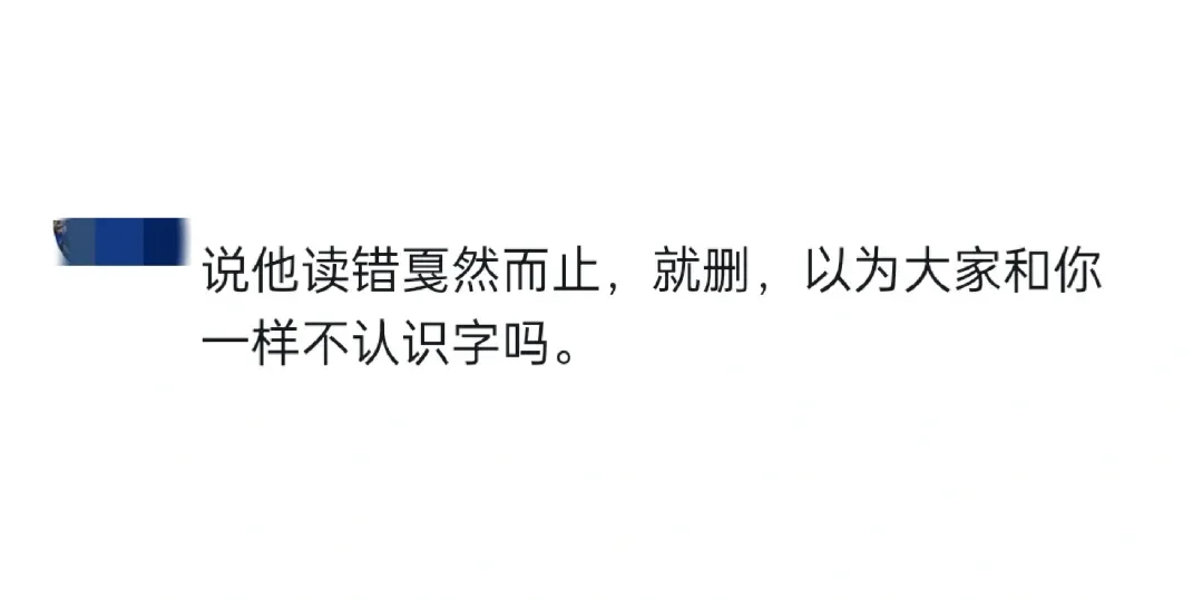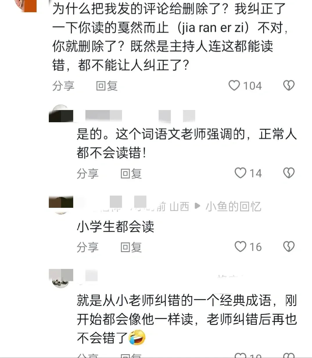 令人意外的是,他把戛(jia)读成了ga,引发评论区众多网友纠正和嘲讽,而且有网友反映自己纠正他的读音被删掉了评论。