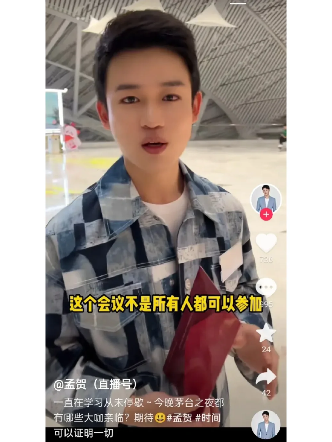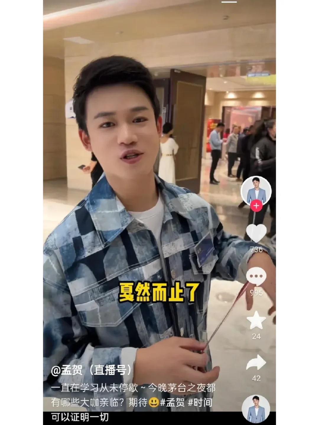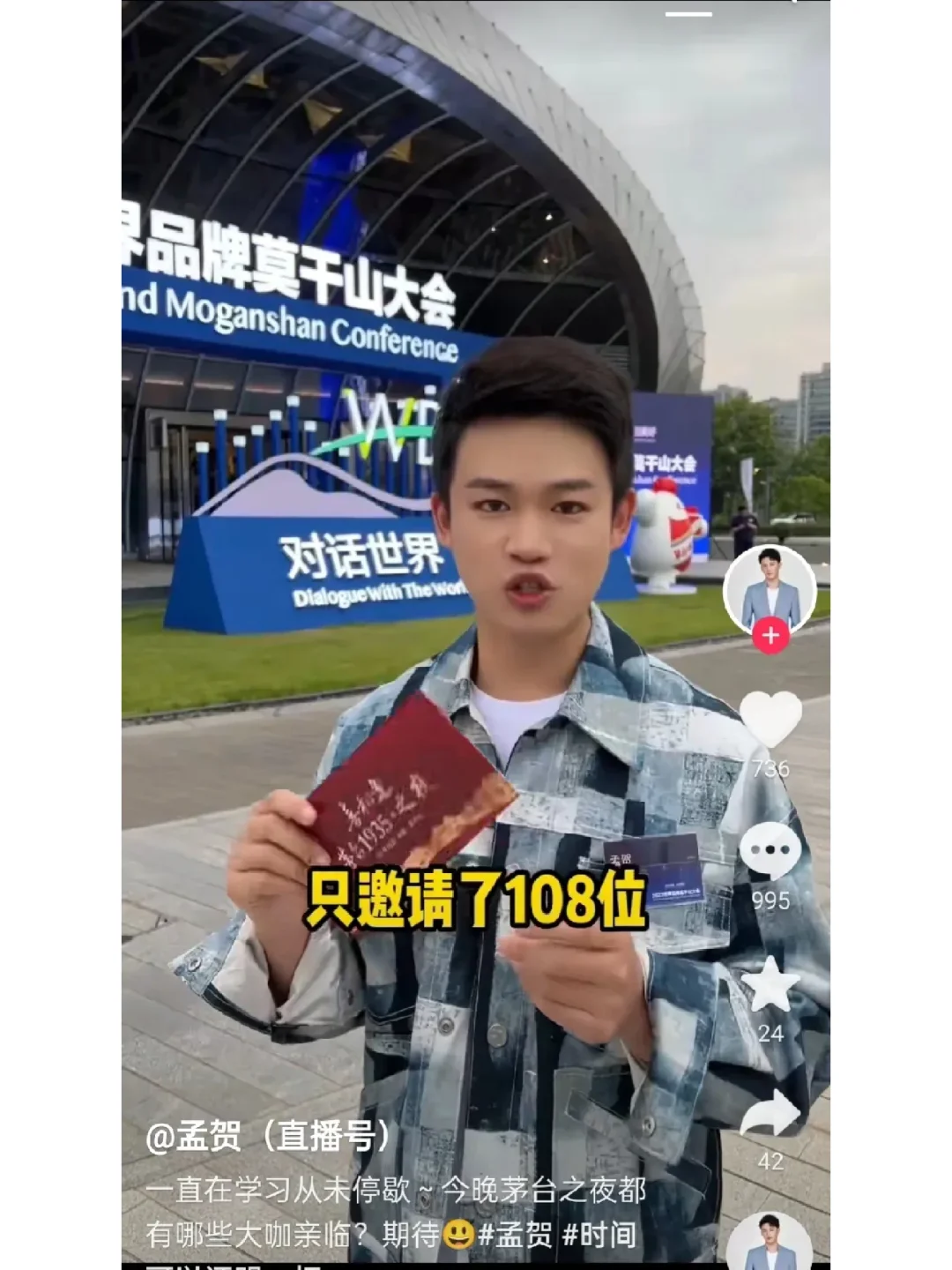 孟贺参加活动出席晚宴,拍视频时介绍该晚宴只邀请了108位嘉宾出席,所以负责摄像的编导小哥哥只能戛然而止了。