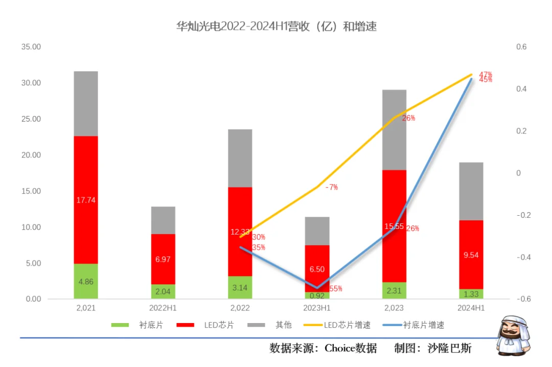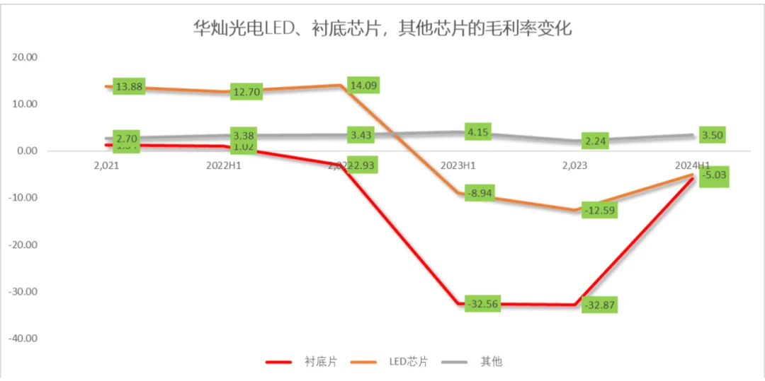 但是从毛利率看,衬底片和LED下滑依然很厉害,比较好的是2024中报的时候,下滑收敛,只有-5%左右。