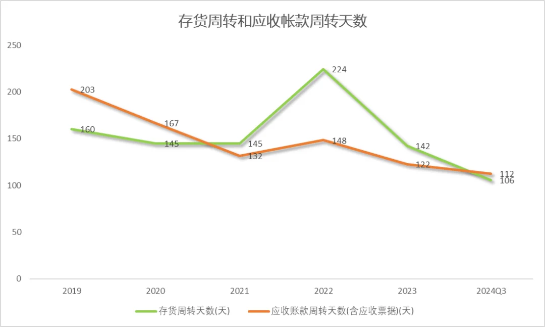资产和信用减值大幅增加,22年资产和信用减值损失总计2.45亿,23年3.8亿,降融资,存货逐步减少,存货和应收账款周转天数大幅降低,预计25年轻装上阵。