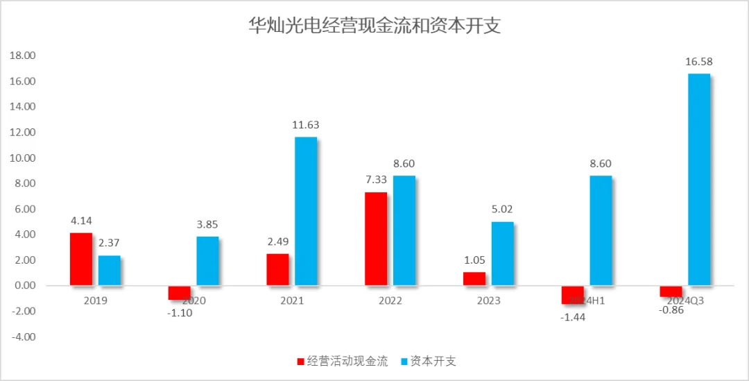 23年公司华灿光电营收29.03亿,同比增长23.28%,24Q3营收29.53亿,同比增长48.73%,营收上基本已经走出低谷,并且保持一个相对快速的增长。与此相对应的是公司的净利润仍然没有起色,23年扣非归母净利润,亏损9.32亿,同比降幅126.21%,24Q3扣非归母净利润亏损4.36亿,同比增长31.18%。至少在净利润增速为正了。