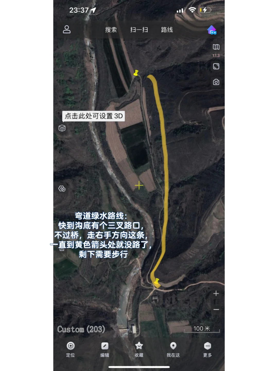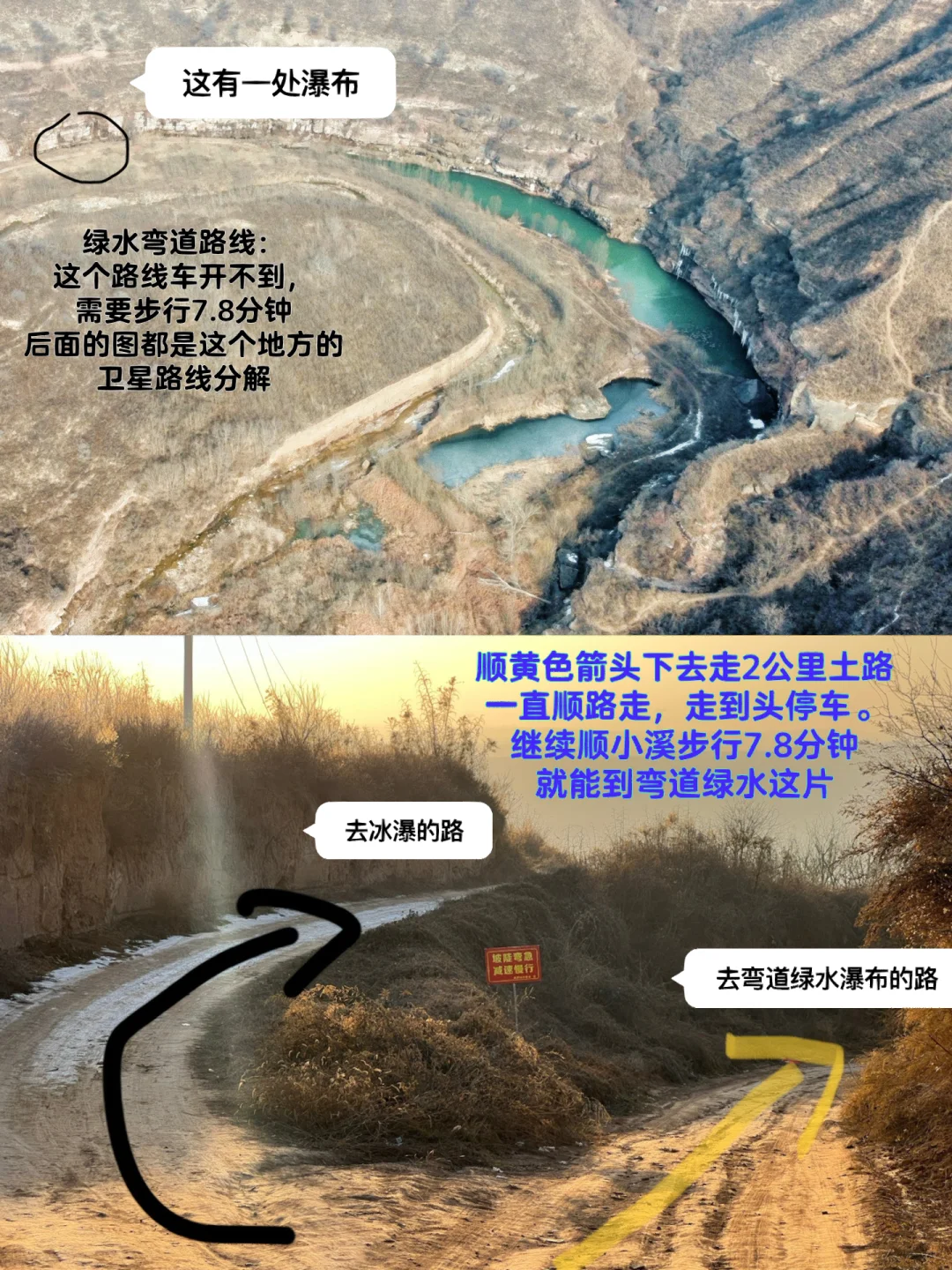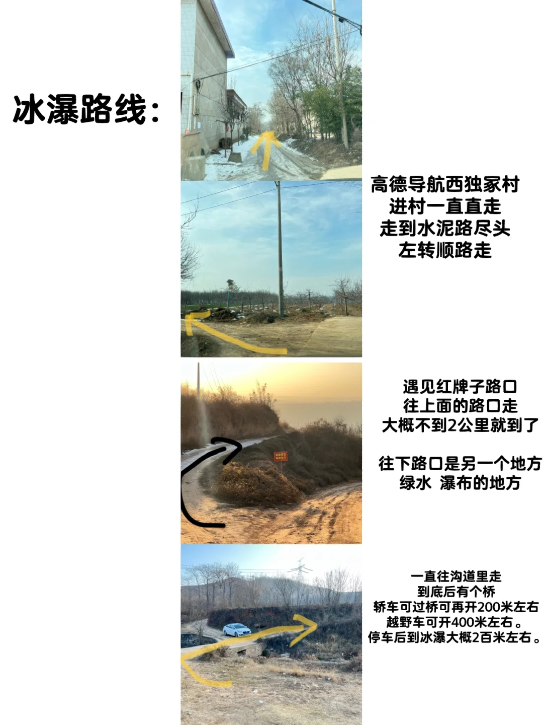 [拔草R][拔草R]弯道绿水那,两个路线,[向右R][向右R]一是导航耀州区西独塚村,到红牌子的分叉路,往上去是冰瀑的路,往下是弯道绿水的路(图十一)往下开2公里烂路土路,快到沟底三岔路口,不过桥!顺右边的路继续开,到田地边停车。田头有小路过小溪,往前继续走路7.8分钟到。 (这条路我没走,问村民告知可以到)