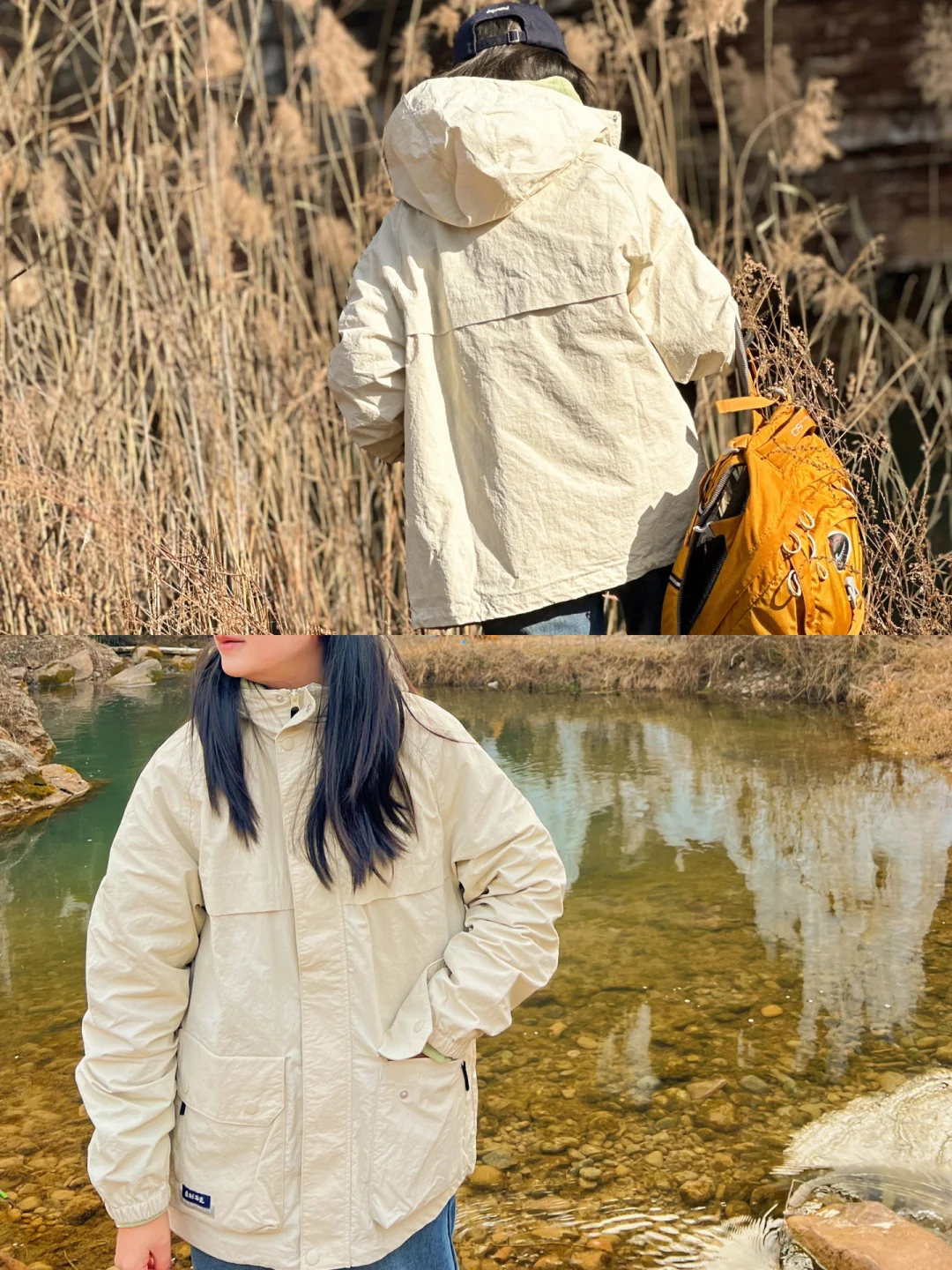 风衣是防风防泼面料,还很透气,双层大口袋,很能装。工装风简约的设计,户外和休闲场合都可以轻松应对。