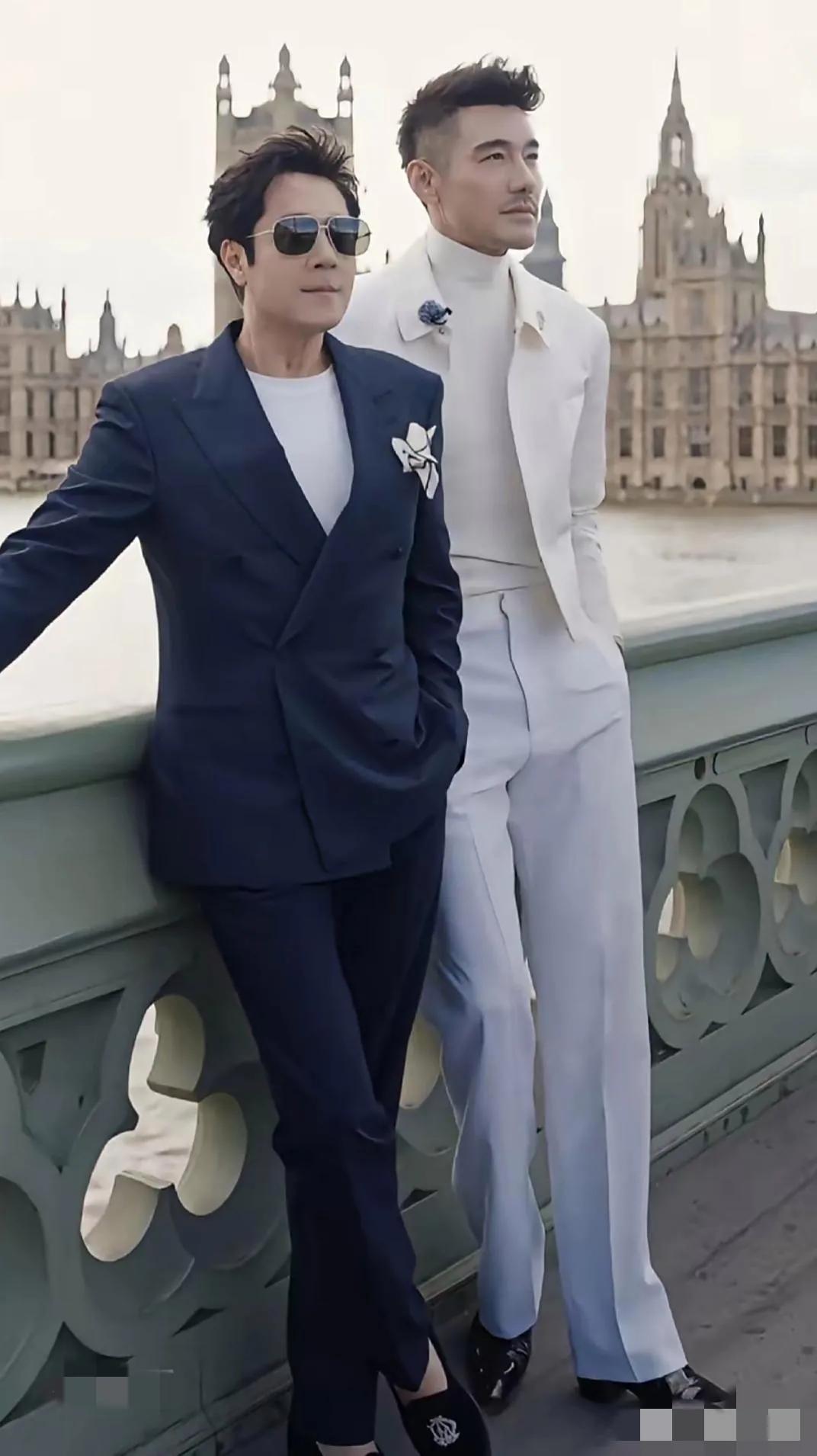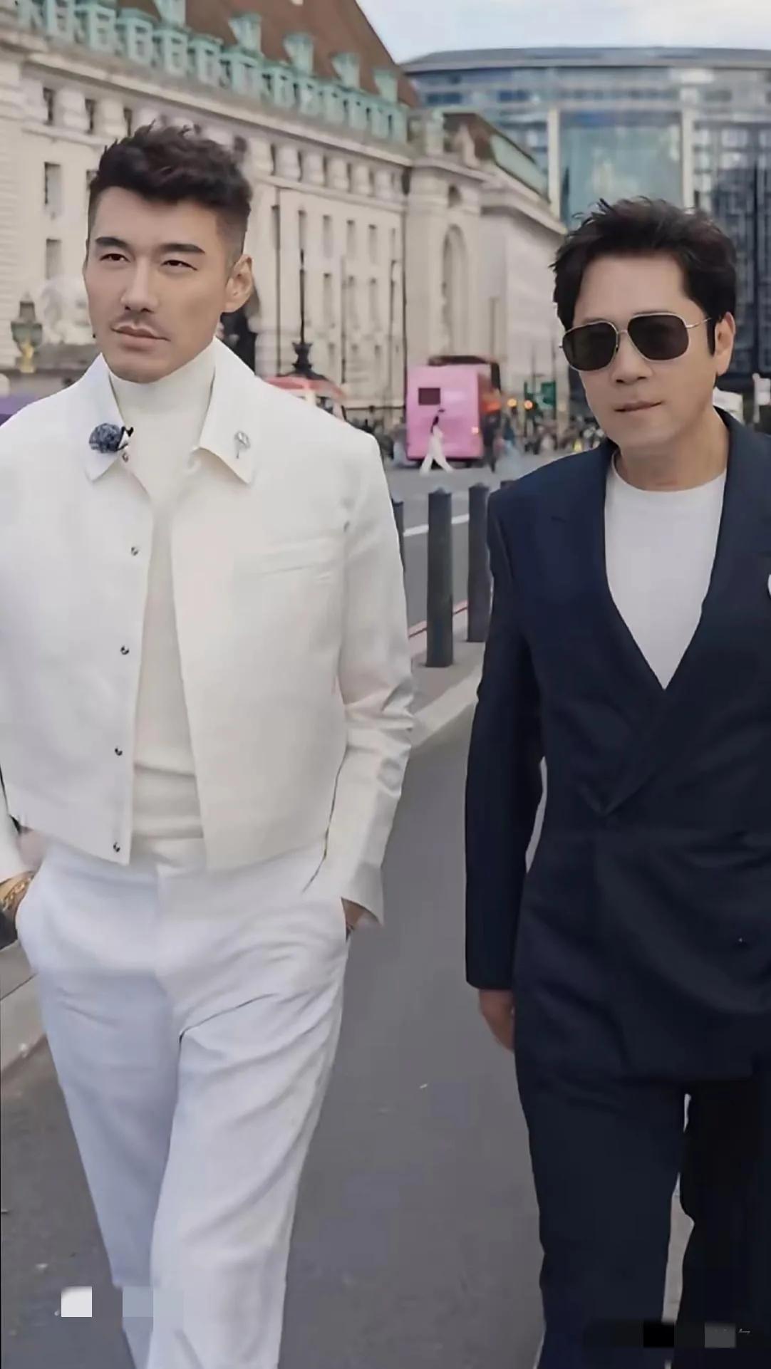 胡兵与蔡国庆同框:一个一袭白衣身材修伟;一个一身西装琼林玉树;一个目若朗星雄浑沉健,一个儒雅潇洒丰神俊逸哈,没想到蔡国庆穿着平底鞋,胡兵穿着有跟鞋两个人的身高也没差多少,你看呢?