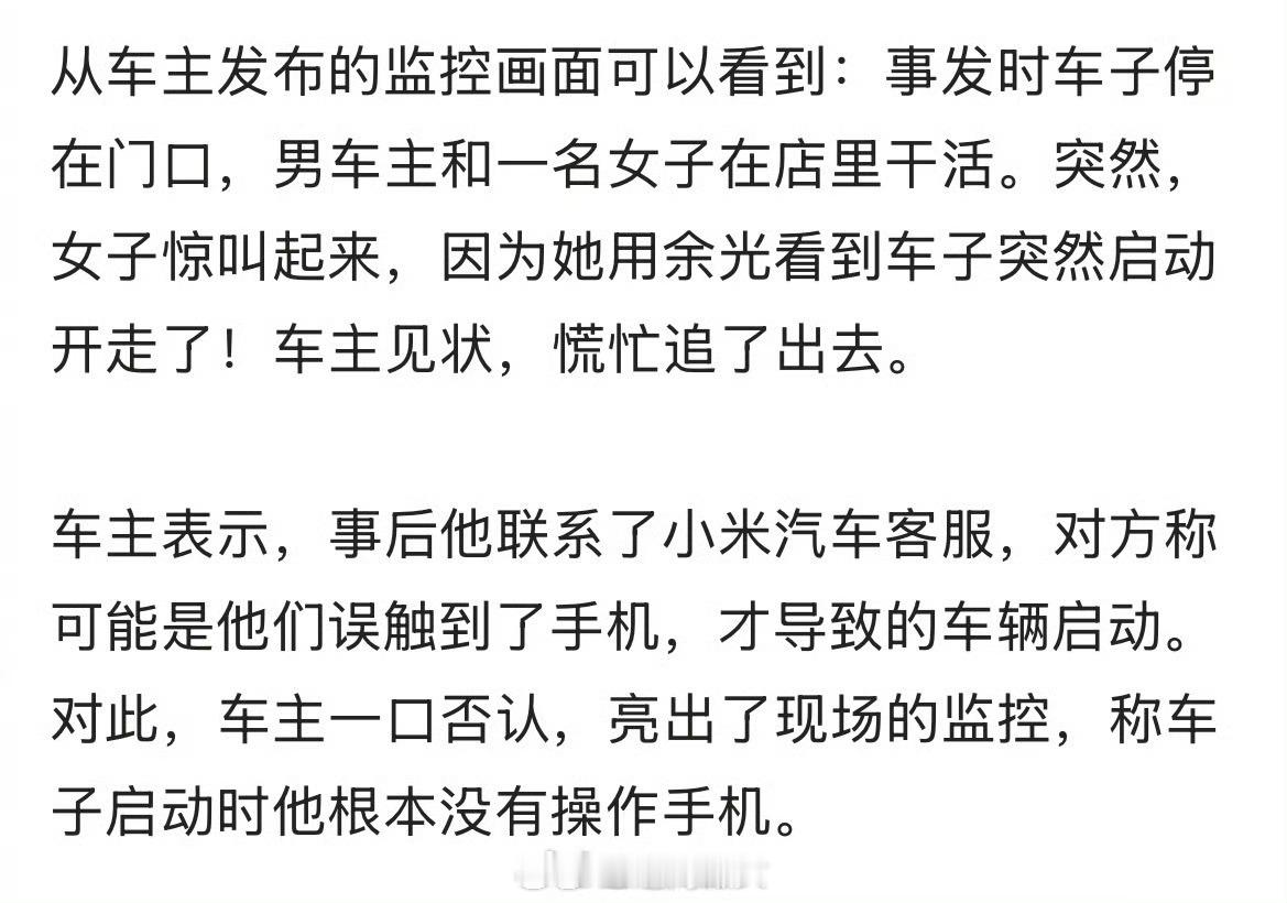 车主称小米汽车突然自己开走 突发,小米车主晒监控,没碰手机的情况下,车自动解锁跑了[吃惊] 小米汽车突然自己开走